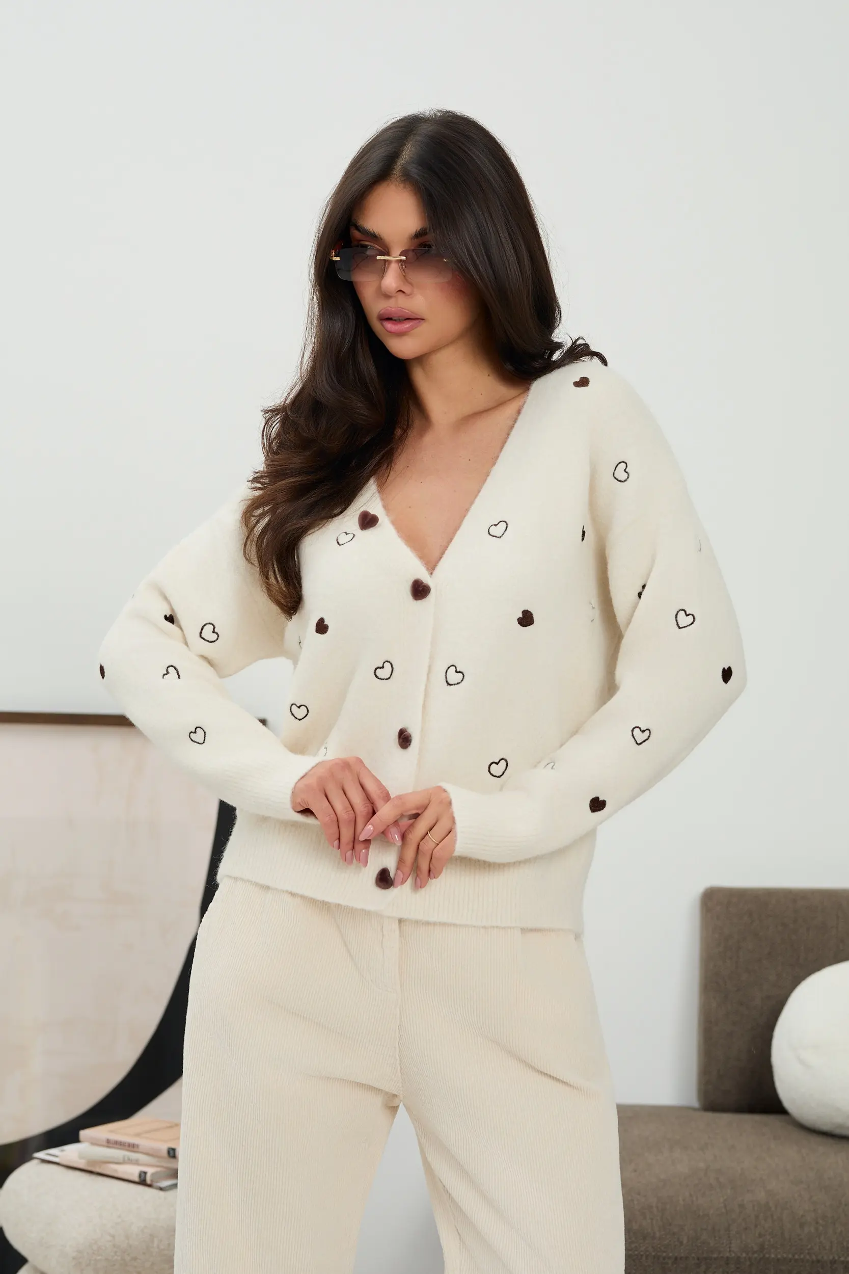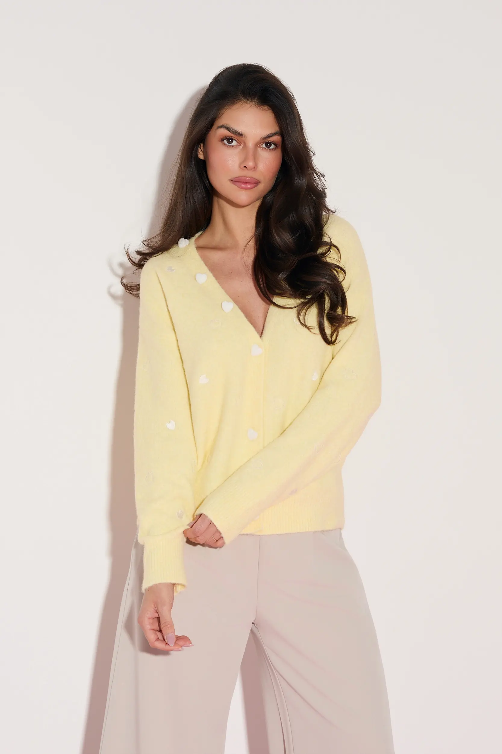 Stylowy kardigan wykonany z miękkiej, przyjemnej w dotyku dzianiny, który zachwyca subtelnym designem i dopracowanymi detalami. Model został ozdobiony drobnymi haftowanymi sercami, nadającymi całości romantycznego, ale wciąż nowoczesnego charakteru. Kardigan zapinany jest na guziki, co pozwala nosić go zarówno klasycznie, jak i rozpięty – jako lekki element warstwowej stylizacji. Dekolt w kształcie litery V pięknie podkreśla szyję i optycznie wysmukla sylwetkę. Luźniejszy, ale nadal kobiecy krój zapewnia komfort noszenia i swobodę ruchów. To model, który doskonale sprawdzi się w codziennych stylizacjach.