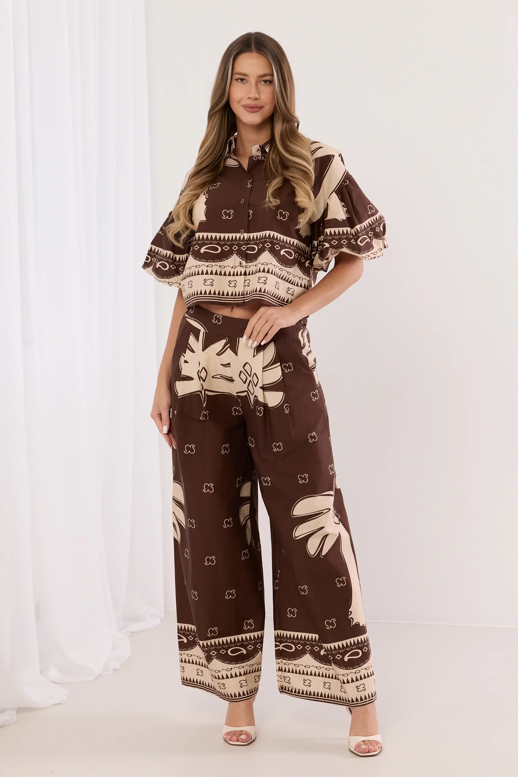Komplet składający się z koszuli o krótkim kroju oraz szerokich spodni, wykonany z lekkiej i przewiewnej tkaniny z wyrazistym nadrukiem o etnicznym charakterze. Koszula z kołnierzykiem i krótkim, bufiastym rękawem zakończonym gumką, co nadaje sylwetce nowoczesnej objętości. Zapięcie na guziki z przodu ukryte pod plisą. Spodnie z wysokim stanem i bardzo szerokimi nogawkami typu palazzo, zapewniające swobodę ruchów i elegancki wygląd. Elastyczny pas z tyłu oraz praktyczne kieszenie w szwach bocznych. Idealny zestaw na letnie wieczory i wakacyjne wyjazdy, łączący swobodę z wyrafinowanym stylem.