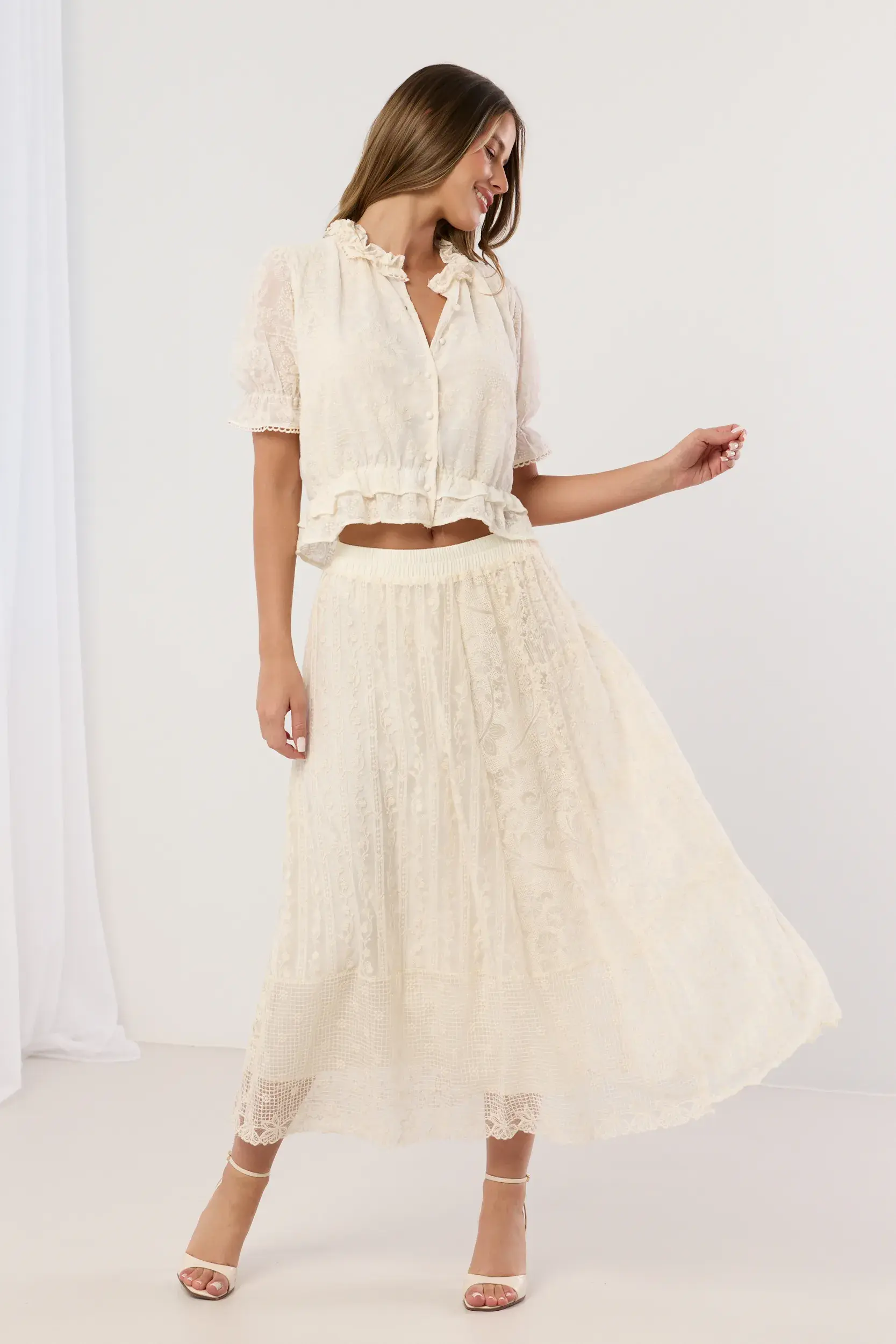 Ażurowy komplet składający się z krótkiej bluzki oraz spódnicy maxi o zwiewnym kroju. Bluzka z kołnierzykiem i zapięciem na guziki z przodu wyróżnia się subtelną falbanką u dołu oraz krótkim rękawem z elastycznym wykończeniem. Spódnica o wysokim stanie z elastycznym pasem dopasowuje się do sylwetki, przechodząc w rozkloszowany dół z ozdobnym haftem i koronkowymi wstawkami. Całość wykonana z lekkiej, transparentnej tkaniny.