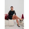 Dwuczęściowy komplet wykonany z tiulu, zdobiony satynowymi aplikacjami kwiatowymi o przestrzennej strukturze. Top o dopasowanej linii z transparentnymi rękawami i efektownym wycięciem na plecach. Spódnica mini podkreślająca sylwetkę, idealnie komponuje się z górą, tworząc elegancką, wieczorową całość o wyrazistej fakturze.