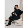 Efektowny komplet wykonany z miękkiej, elastycznej dzianiny o wyrazistym, brokatowym połysku. Całość zdobią drobne kryształkowe akcenty, rozmieszczone równomiernie na całej powierzchni materiału, tworząc subtelny, biżuteryjny efekt. Góra ma dopasowany krój, gładki dekolt i długie rękawy, dzięki czemu pięknie podkreśla linię ramion i nadaje sylwetce nowoczesnej elegancji. Spodnie w tym samym wykończeniu tworzą spójną, harmonijną całość — ich lekko luźniejszy fason zapewnia komfort, a jednocześnie prezentuje się niezwykle stylowo. Komplet idealnie łączy wygodę z wieczorowym glamem, sprawdzając się zarówno w zestawach imprezowych, jak i w codziennych stylizacjach, którym chcesz dodać nutę modowego blasku.