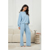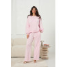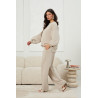 Luźny komplet dresowy o oversizowej sylwetce, zaprojektowany z myślą o codziennym komforcie. Bluza ma swobodny krój z obniżoną linią ramion oraz szerokimi rękawami, które nadają całości miękki, niezobowiązujący charakter. Prosty dekolt i gładkie wykończenia podkreślają minimalistyczny styl modelu. Spodnie o szerokich, prostych nogawkach zapewniają pełną swobodę ruchu i naturalnie układają się na sylwetce. Elastyczny pas z regulacją na troczki umożliwia dopasowanie, a pionowe przeszycia wzdłuż nogawek porządkują fason i optycznie wydłużają linię nóg. Kieszenie boczne zostały dyskretnie wkomponowane w konstrukcję spodni, nie zaburzając czystej linii. Komplet wykonany z dzianiny, która zwiększa komfort noszenia i nadaje całości lekkości.