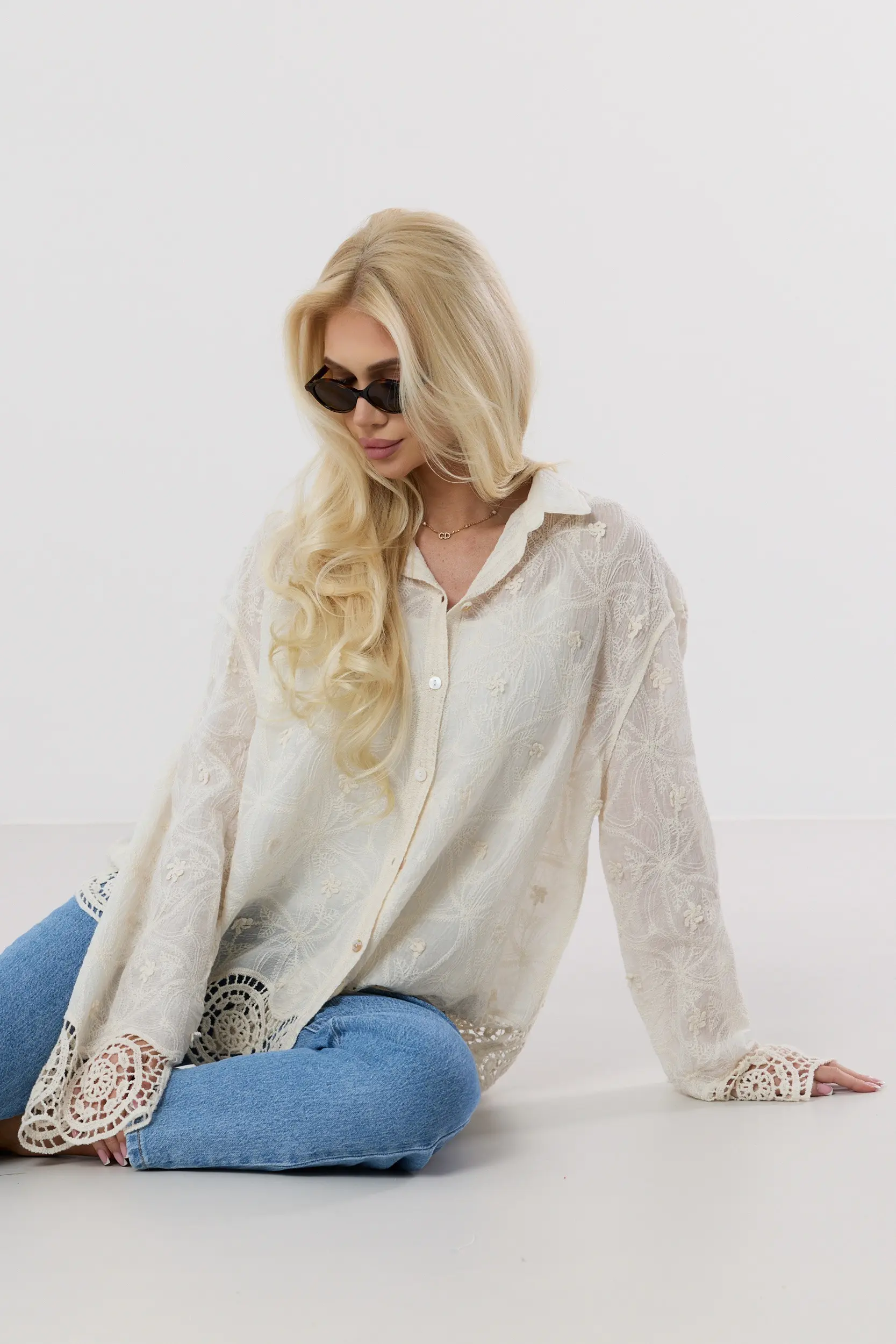 Koszula o swobodnym kroju, która zachwyca bogatymi zdobieniami. Wykonana z lekkiego, lekko prześwitującego materiału, została w całości pokryta subtelnym haftem o motywach roślinnych. Najbardziej charakterystycznym elementem są szerokie, ażurowe wykończenia u dołu oraz przy mankietach rękawów, przypominające kunsztowną koronkę. Model posiada klasyczny kołnierzyk i jest zapinany na guziki. To idealna propozycja do letnich stylizacji z jeansami, łącząca w sobie klasyczną biel z nutą stylu boho i nowoczesną kobiecością.