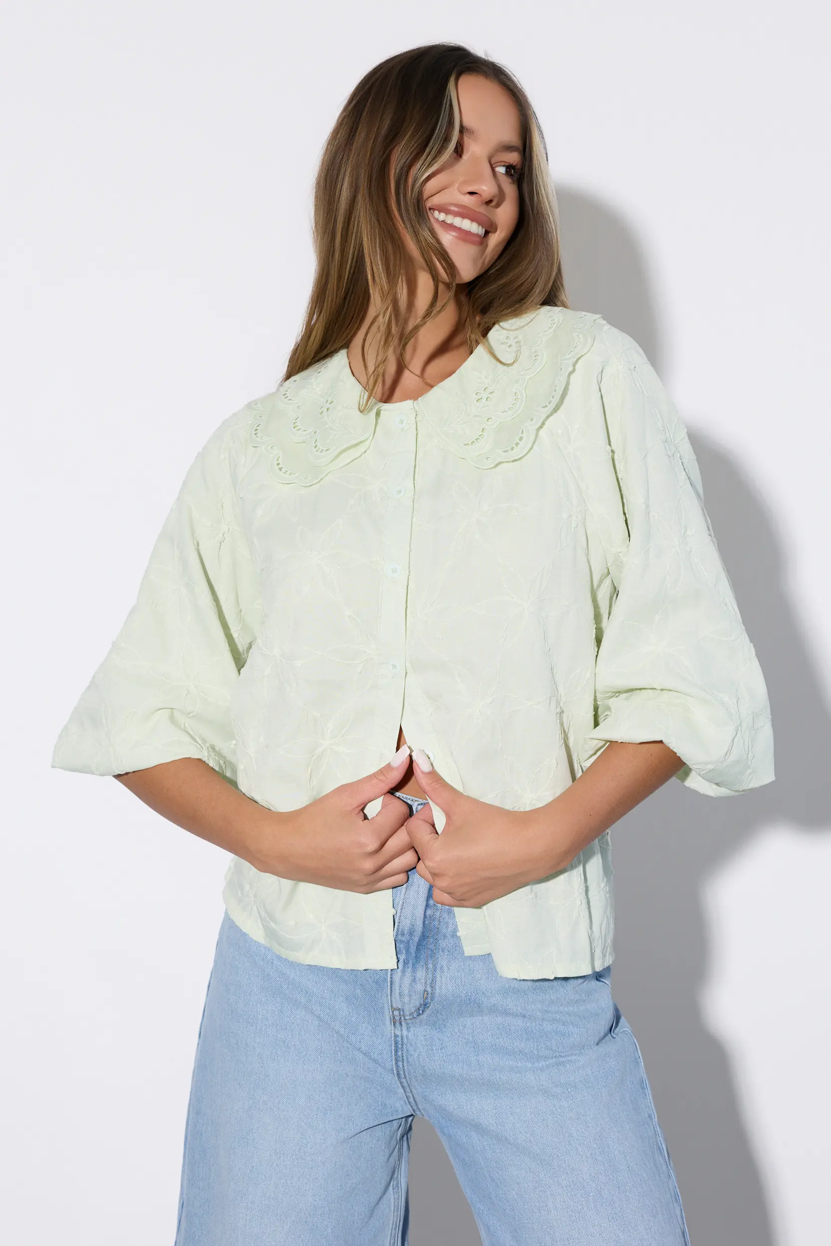 Koszula o luźnym kroju. Model wyróżnia się szerokim, dekoracyjnym kołnierzem z misternym haftem ażurowym i falbankowym wykończeniem brzegów. Długie, obszerne rękawy o fasonie baloniastym zakończone są elastycznym mankietem. Całość zdobi subtelny, wypukły haft o motywie florystycznym. Zapięcie z przodu na dopasowane kolorystycznie guziki ukryte pod listwą. Idealna propozycja do zestawienia z klasycznym denimem lub materiałowymi spodniami z wysokim stanem.