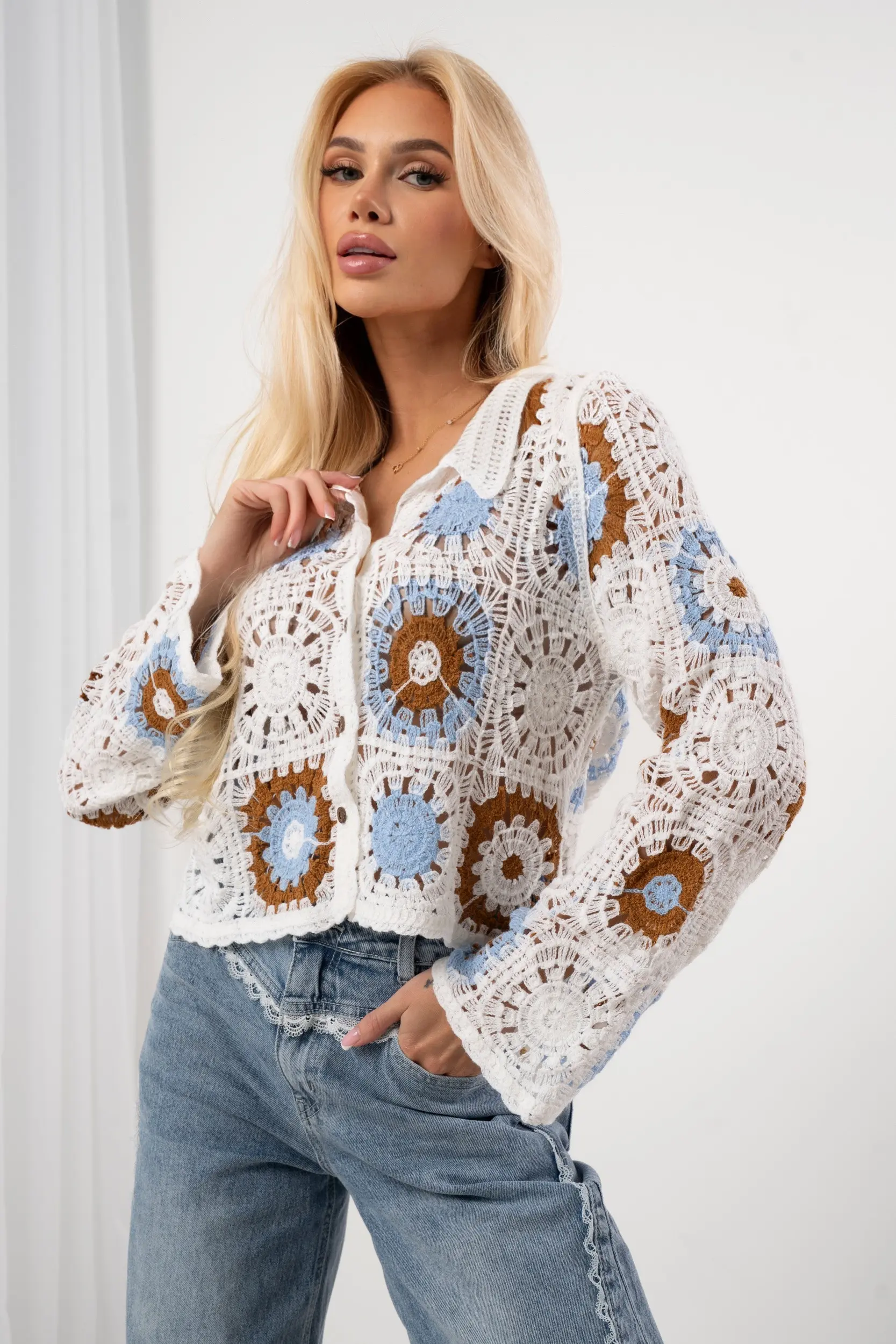 Koszula o ażurowym splocie wykonana z dzianiny z efektem szydełkowym. Model o dopasowanym kroju z dekoltem w serek oraz klasycznym kołnierzykiem. Długie rękawy wykończone prostym brzegiem. Zapięcie z przodu na kontrastowe guziki. Całość zdobi regularny motyw geometrycznych rozet, który nadaje sylwetce teksturę i trójwymiarowość. Wyrazisty splot i rzemieślnicze wykończenie sprawiają, że projekt łączy estetykę retro z nowoczesnym miejskim stylem. Idealna propozycja do zestawienia z denimem lub zwiewnymi tkaninami.