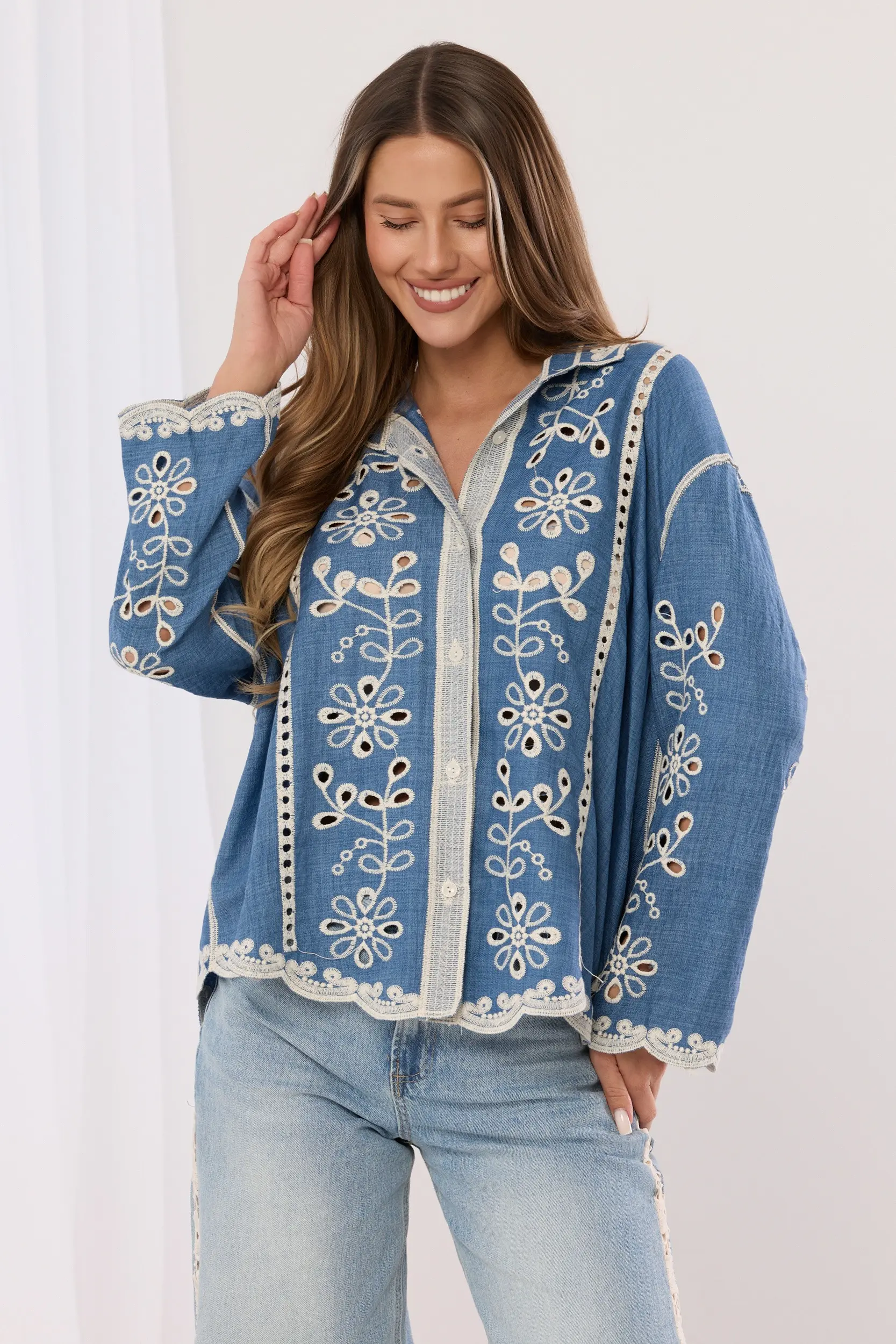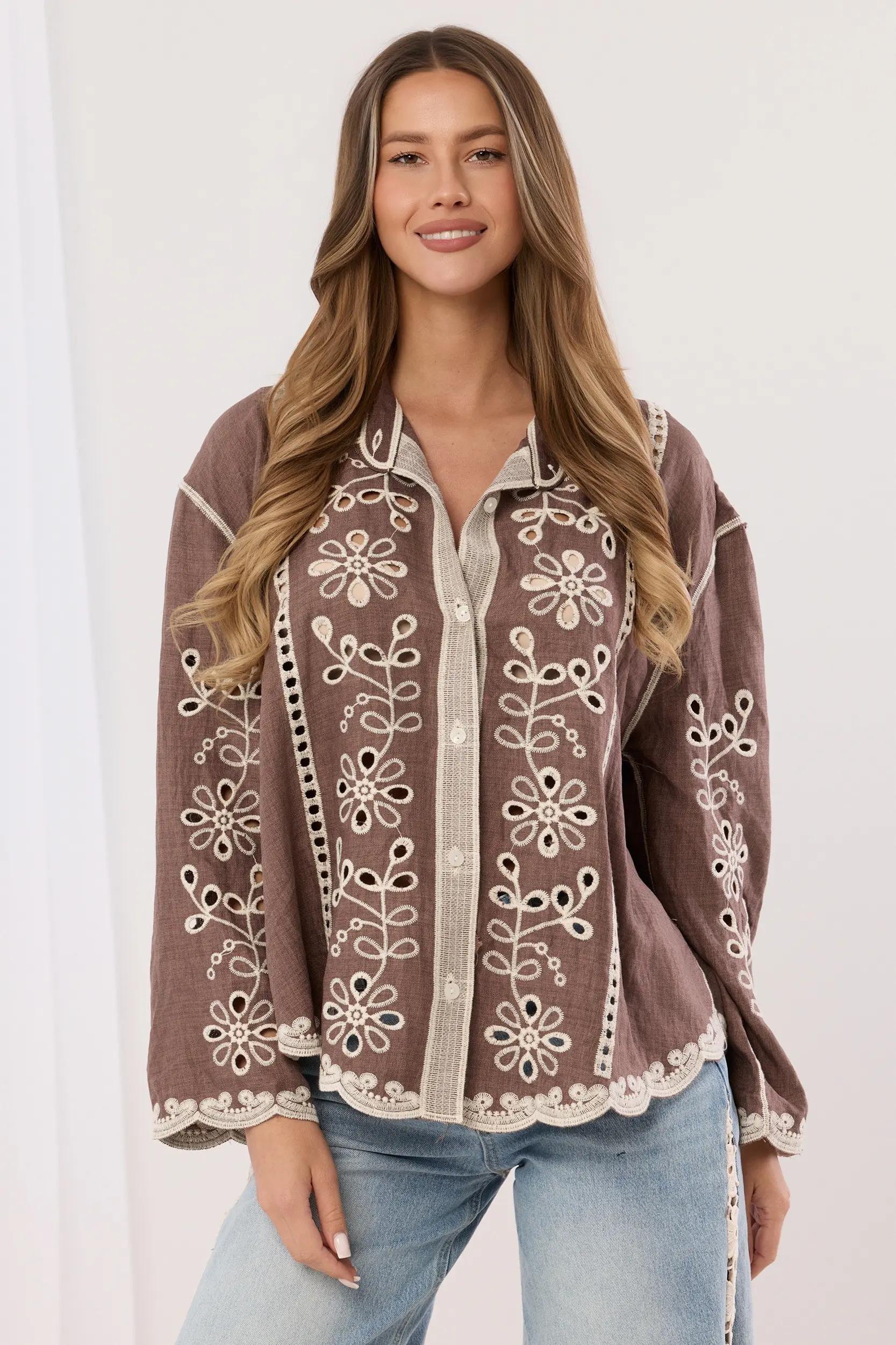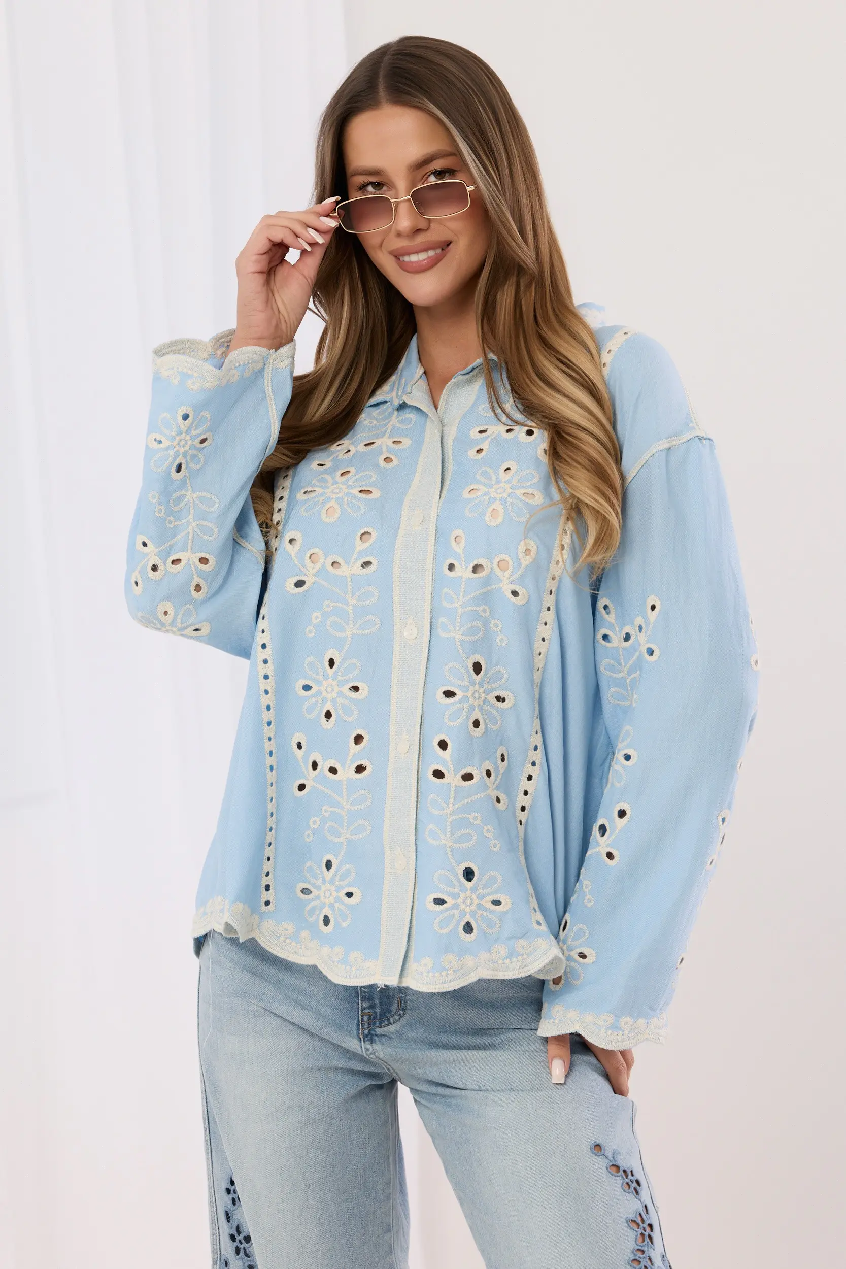 Koszula o luźnym kroju wykonana z tkaniny o wyraźnej strukturze, która nadaje całości rustykalny i naturalny charakter. Model z klasycznym kołnierzykiem i długim rękawem wykończonym mankietem. Głównym elementem dekoracyjnym są misterne hafty oraz ażurowe wycięcia typu richelieu, tworzące symetryczne, florystyczne motywy na przedzie i rękawach. Ozdobna listwa guzikowa oraz dół wykończony falistym brzegiem z kontrastową lamówką podkreślają dbałość o detale. Idealna propozycja do swobodnych, letnich stylizacji z nutą boho, łącząca rzemieślniczy kunszt z nowoczesną formą oversize.