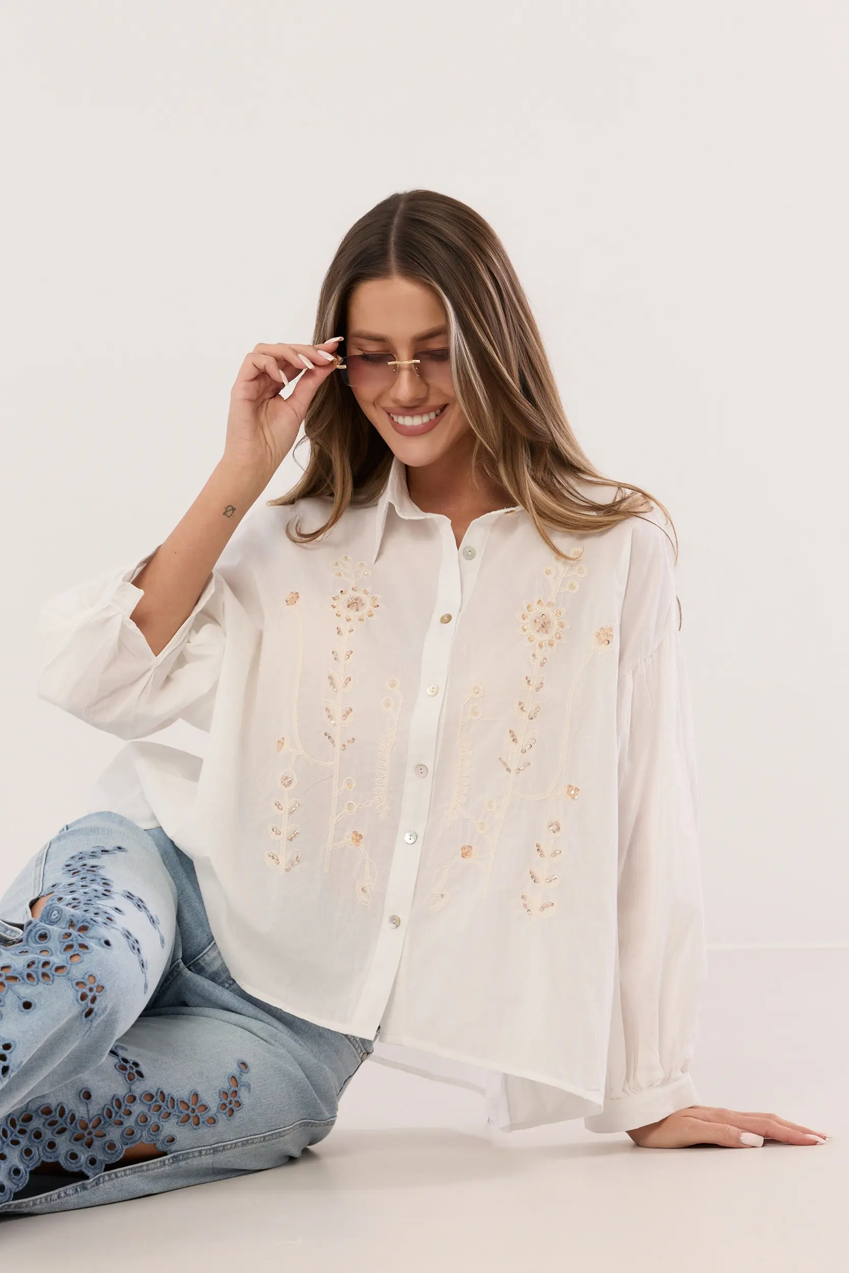 Koszula o luźnym kroju wykonana z lekkiej, przewiewnej tkaniny o subtelnym splocie. Model z klasycznym kołnierzykiem i długim rękawem wykończonym elastycznym mankietem, który nadaje mu delikatną objętość. Front zdobią kunsztowne, wypukłe hafty o motywach florystycznych oraz precyzyjnie rozmieszczone aplikacje z koralików i cekinów, które nadają całości unikalny charakter w stylu boho. Zapięcie z przodu na guziki z efektem masy perłowej. Dół wykończony prostym cięciem, idealnie komponujący się z denimem.