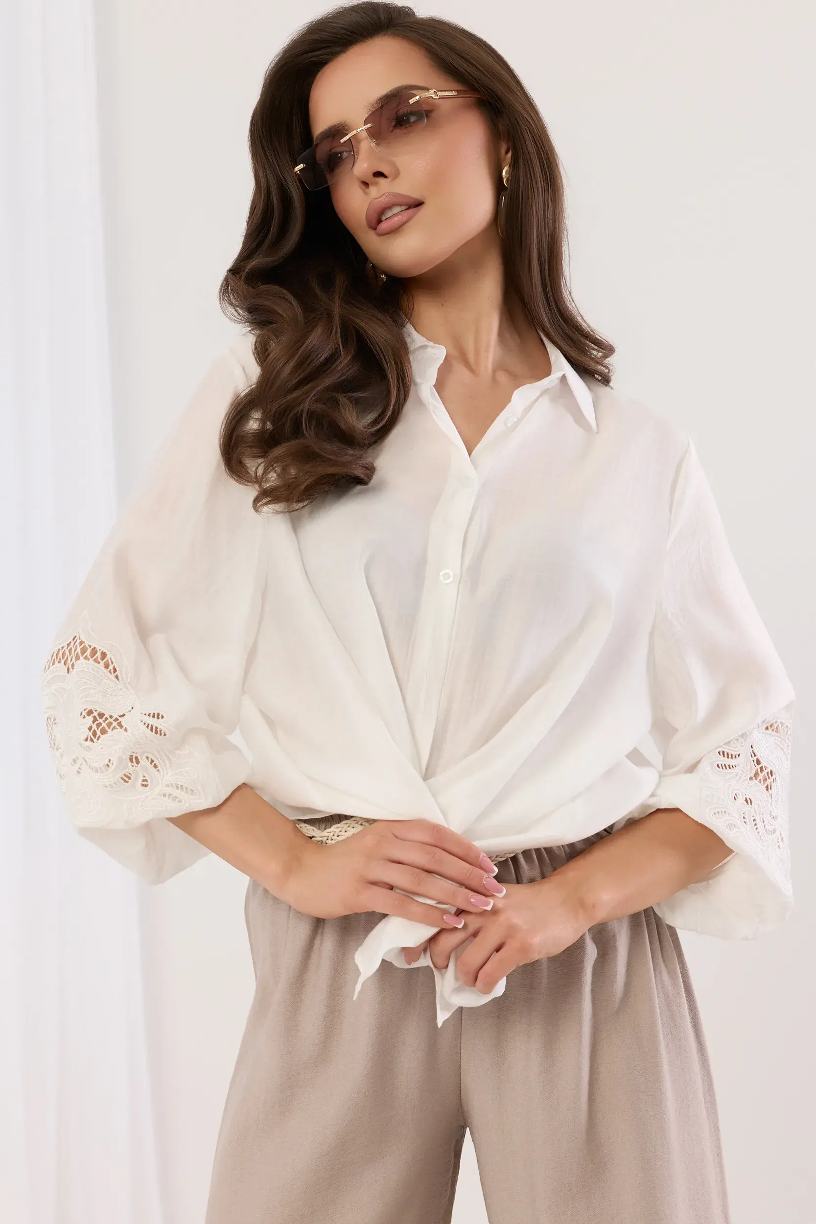 Koszula o luźnym kroju wykonana z lekkiej tkaniny. Model z kołnierzykiem i długim rękawem wykończonym elastycznym mankietem. Wyjątkowy charakter nadają jej misterne, ażurowe hafty oraz subtelne wycięcia typu richelieu umieszczone na rękawach. Zapięcie z przodu na dopasowane guziki. Obniżona linia ramion zapewnia swobodę ruchów, a delikatna faktura materiału gwarantuje komfort noszenia przez cały dzień.