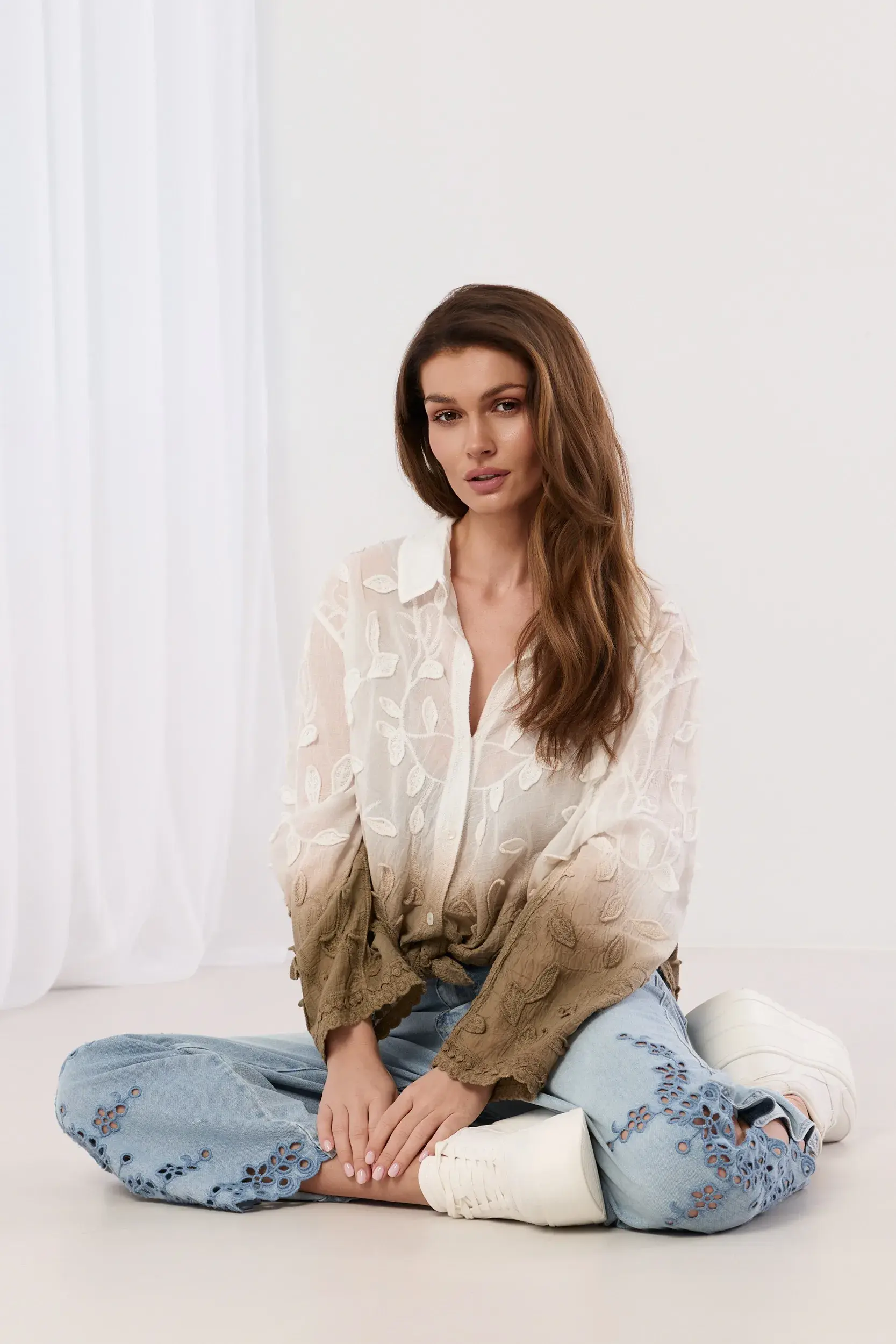 Koszula o luźnym kroju wykonana z lekkiej, półtransparentnej tkaniny z ozdobnym haftem w motywy roślinne na całości. Model z kołnierzykiem i długim rękawem zakończonym dekoracyjną listwą. Zapięcie z przodu na guziki ukryte pod plisą. Oryginalne wykończenie z efektem cieniowania u dołu oraz fantazyjne wiązanie podkreślające talię nadają sylwetce nowoczesny charakter.