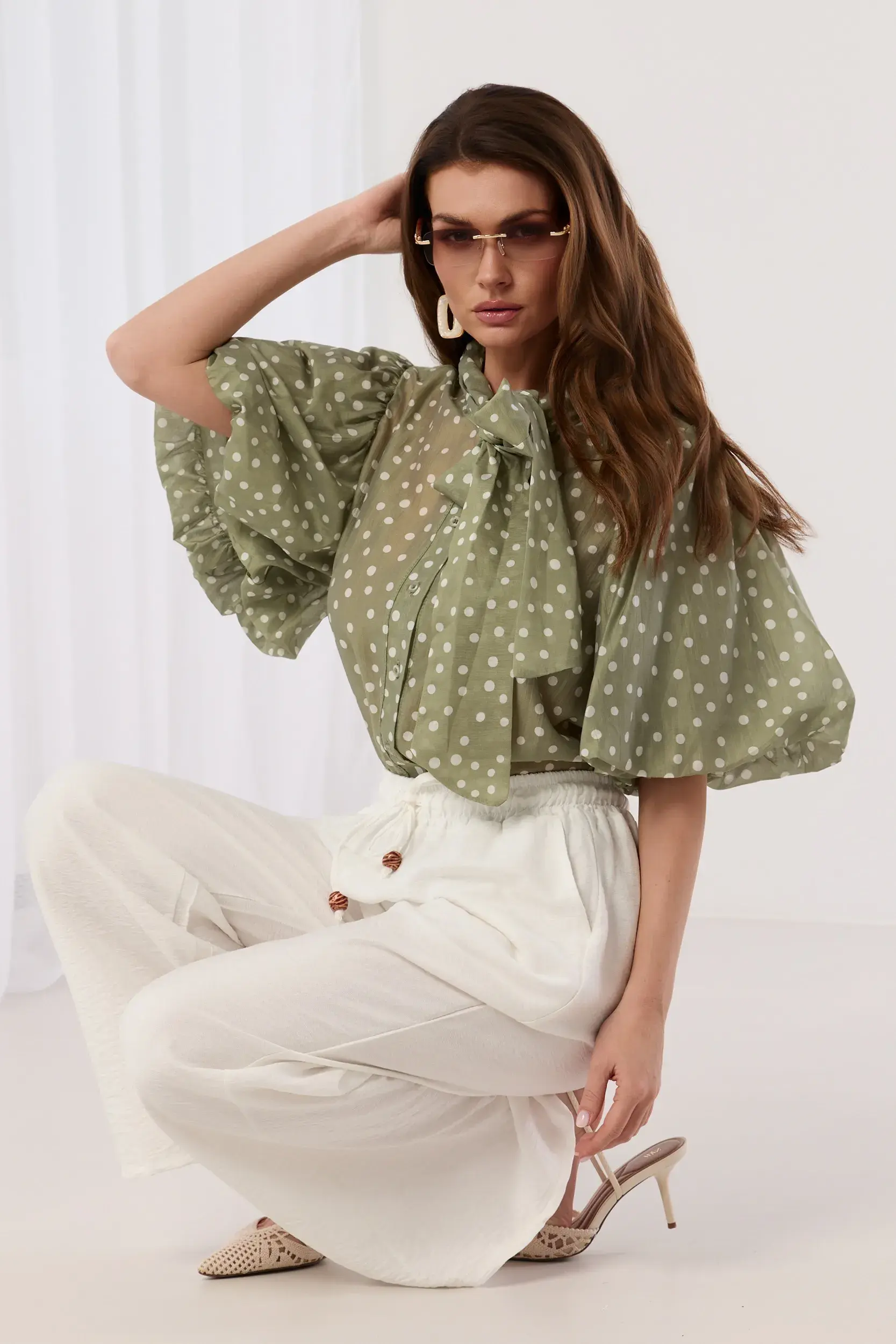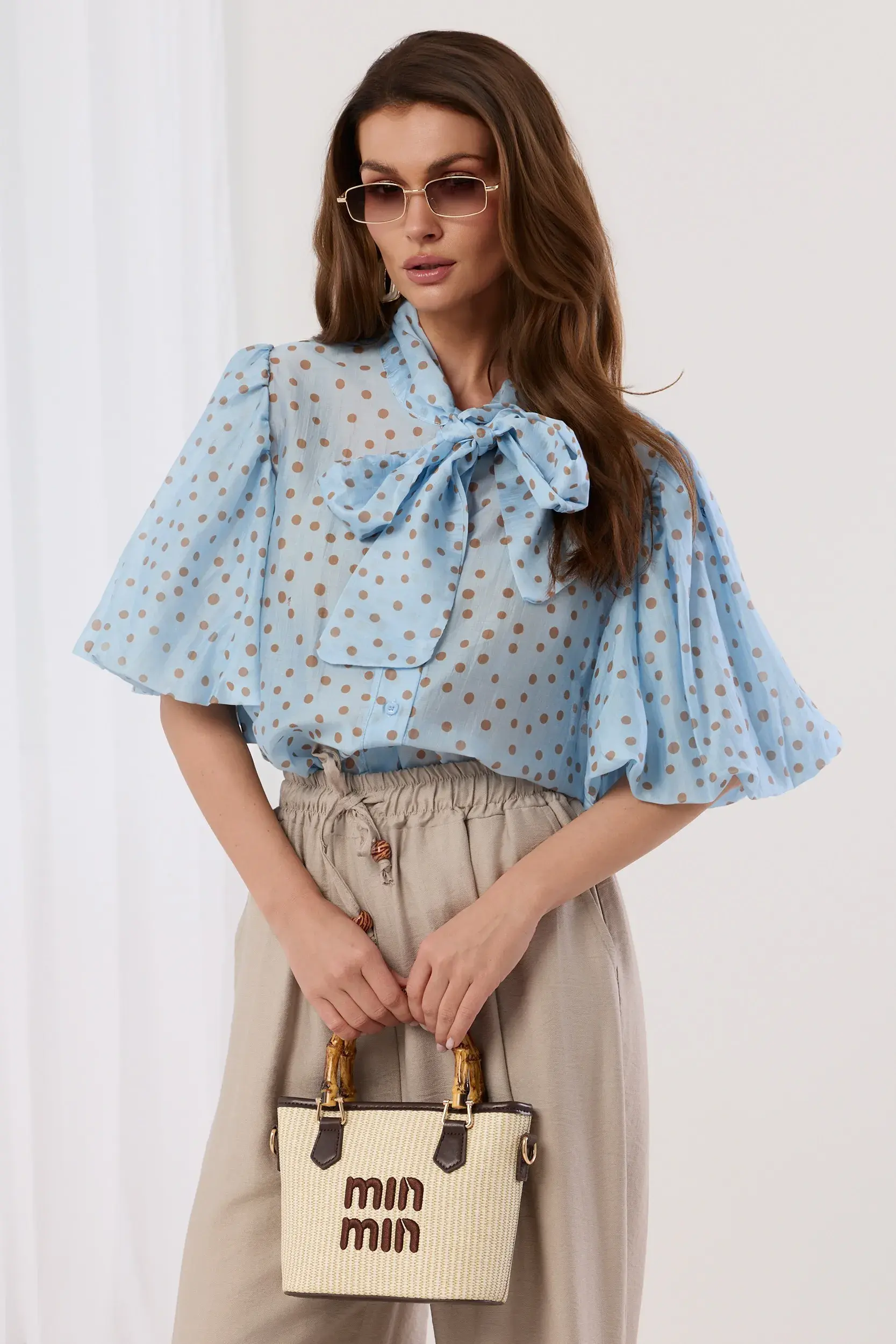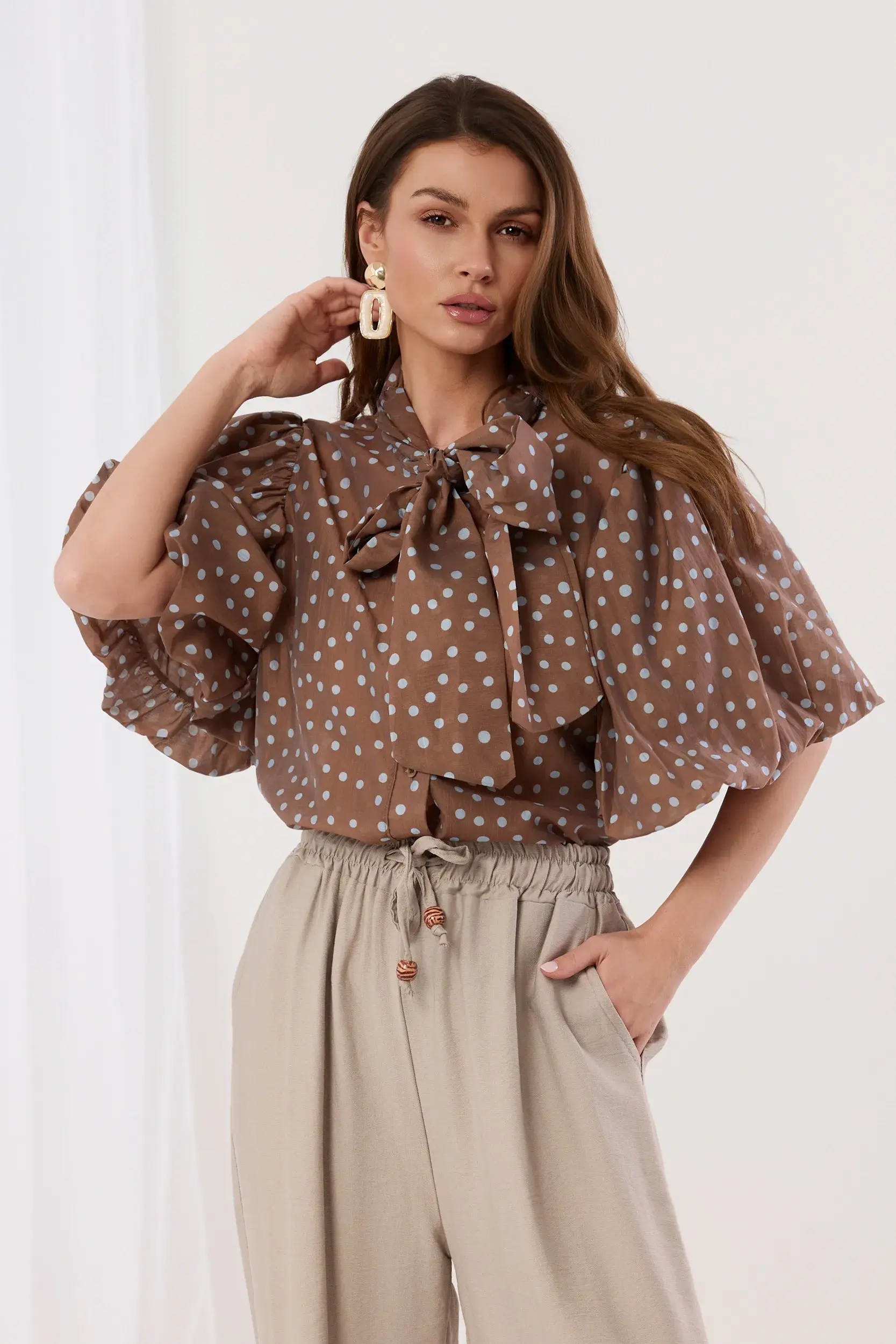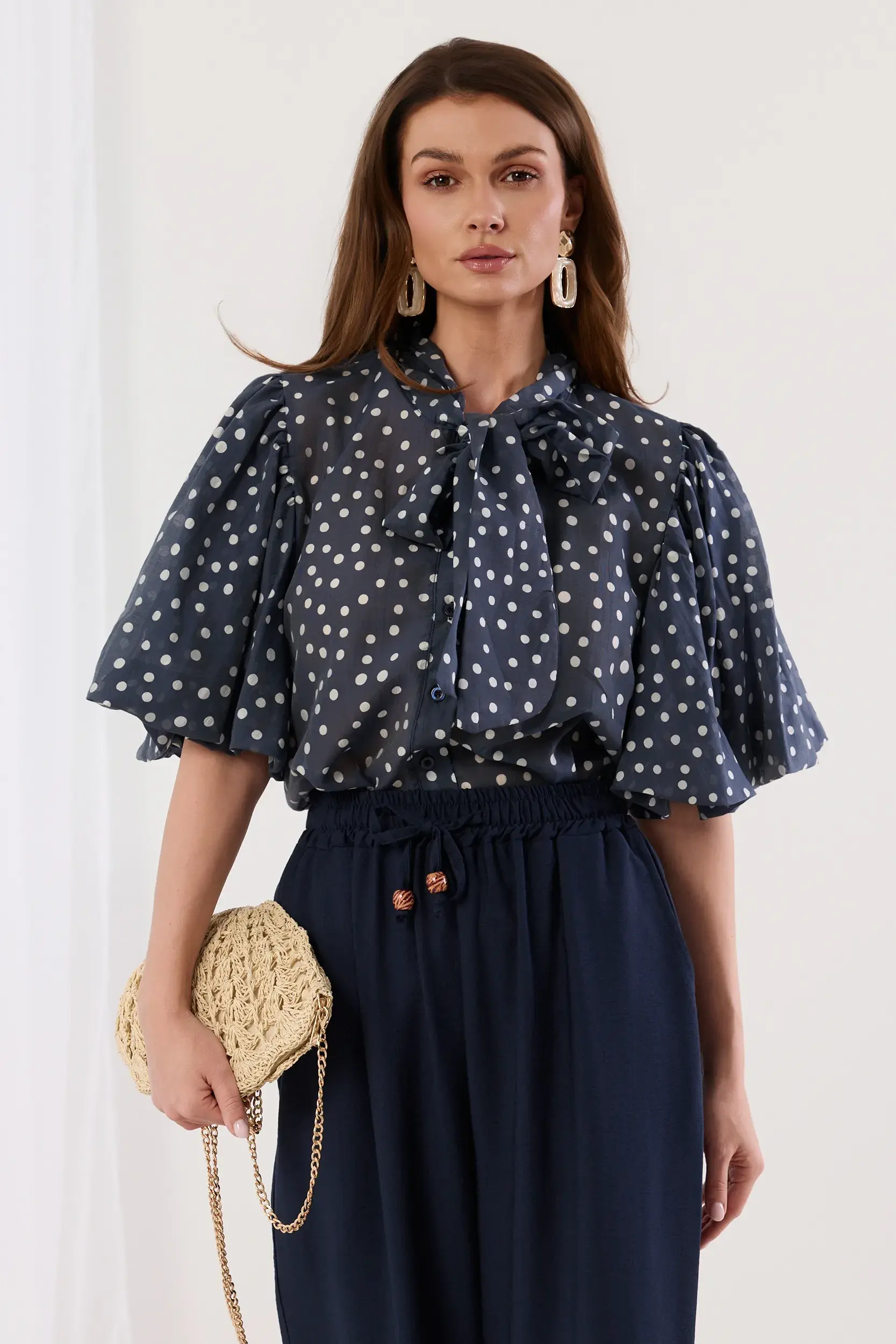 Koszula w grochy z bufiastymi rękawami i wiązaniem pod szyją