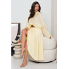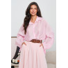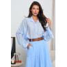 Koszula o oversizowym kroju, wykonana z lekkiej, półtransparentnej tkaniny w delikatne pionowe paski. Luźna forma zapewnia swobodę noszenia i dobrze układa się na sylwetce. Model z klasycznym kołnierzem i zapięciem na guziki na całej długości. Charakterystycznym elementem są balonowe rękawy z obniżoną linią ramion, zakończone mankietami z wiązaniem, które pozwala regulować ich szerokość. Materiał jest zwiewny i przewiewny, idealny na cieplejsze dni. Koszula sprawdzi się zarówno noszona luźno, jak i częściowo wpuszczona w spódnicę lub spodnie, tworząc lekki, wiosenny look.