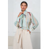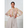 Koszula z lekkiej tkaniny w pionowe paski, idealna do wiosennych stylizacji. Model z długimi, szerokimi rękawami zakończonymi mankietami zapinanymi na guziki. Przy szyi wiązanie w formie kokardy, które pozwala regulować dekolt i nadaje całości subtelnie elegancki charakter. Swobodnie układa się na sylwetce i dobrze łączy się zarówno z prostymi spodniami, jak i spódnicą.