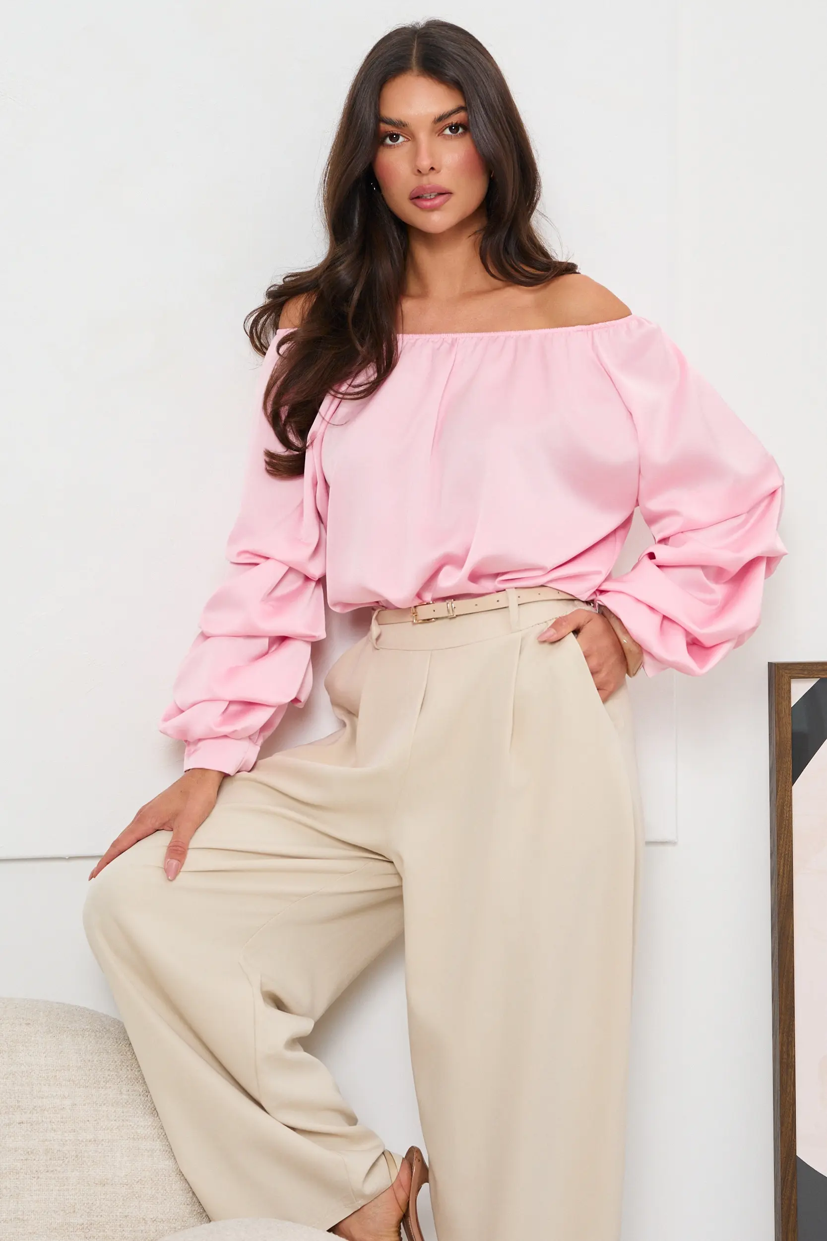 Satynowa bluzka typu hiszpanka o wyraźnie oversize’owym kroju, zapewniającym swobodę i lekkość noszenia. Luźna forma miękko układa się na sylwetce, tworząc nowoczesną, niewymuszoną linię. Dekolt z elastycznym wykończeniem subtelnie eksponuje ramiona, zachowując komfort i stabilność. Model wyróżnia się szerokimi, falbaniastymi rękawami o dekoracyjnym układzie, które nadają całości efektowny, modowy charakter. Gładka, satynowa tkanina podkreśla płynność kroju i naturalny ruch materiału, sprawdzając się zarówno w eleganckich, jak i bardziej swobodnych stylizacjach.