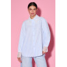 Koszula w delikatne, pionowe paski to połączenie klasyki z romantycznym detalem – model o swobodnym, lekko luźnym kroju, a subtelnie wydłużony tył dodaje jej nowoczesnego charakteru. Uwagę przyciąga ozdobny kołnierzyk wykończony efektowną, kwiatową koronką, która nadaje całości elegancji i kobiecej lekkości. Długie rękawy zakończone są szerokimi, koronkowymi mankietami, harmonijnie nawiązującymi do wykończenia przy szyi. Koszula zapinana jest na drobne, dekoracyjne guziki, które stanowią subtelny akcent biżuteryjny. Lekka, przyjemnie układająca się tkanina sprawia, że model doskonale sprawdzi się zarówno w stylizacjach codziennych z jeansami, jak i w bardziej eleganckich zestawach do pracy czy na spotkania.
