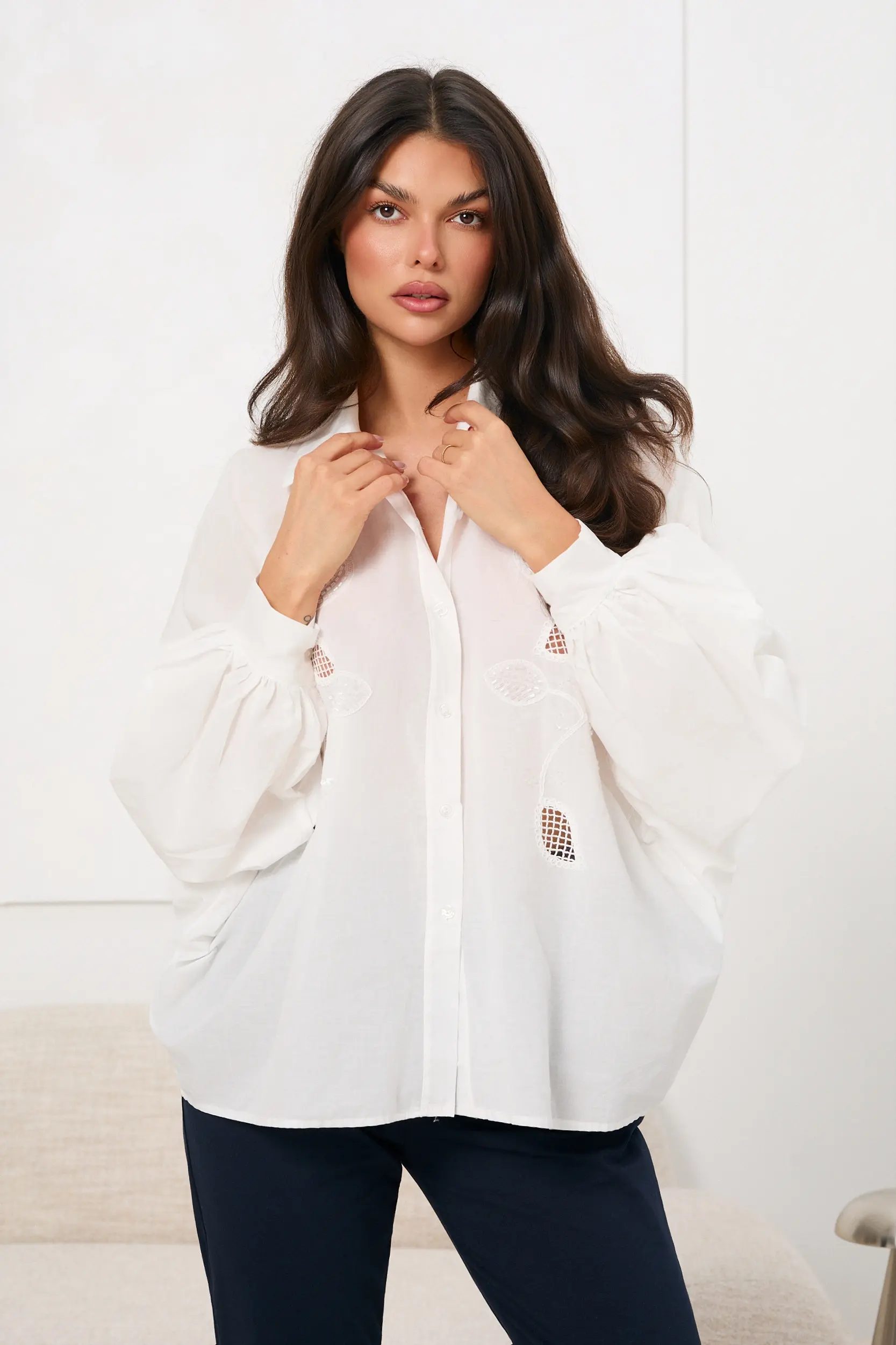 Koszula o luźnym, swobodnym kroju zachwyca elegancką prostotą i subtelnymi detalami, które nadają jej wyjątkowego charakteru – posiada klasyczny kołnierzyk oraz zapięcie na guziki na całej długości, a jej wyróżnikiem są efektowne, szerokie rękawy o lekko bufiastej formie zakończone mankietem, które dodają stylizacji kobiecej lekkości; uwagę przyciągają również subtelne haftowane aplikacje z ażurowymi wstawkami umieszczone z przodu, wprowadzające romantyczny i delikatny akcent, dzięki czemu koszula doskonale sprawdzi się zarówno w eleganckich zestawieniach z materiałowymi spodniami, jak i w bardziej casualowych stylizacjach.
