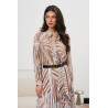 Elegancka koszula o luźnym, lekko oversize’owym kroju zachwyca subtelną, geometryczną kompozycją pasków. Wykonana z lekkiego, zwiewnego materiału, miękko układa się na sylwetce, zapewniając komfort noszenia. Posiada klasyczny kołnierzyk, zapięcie na guziki na całej długości oraz długie rękawy zakończone mankietami. Jej wyrafinowany wzór i harmonijna kolorystyka nadają stylizacji nowoczesnej elegancji.
