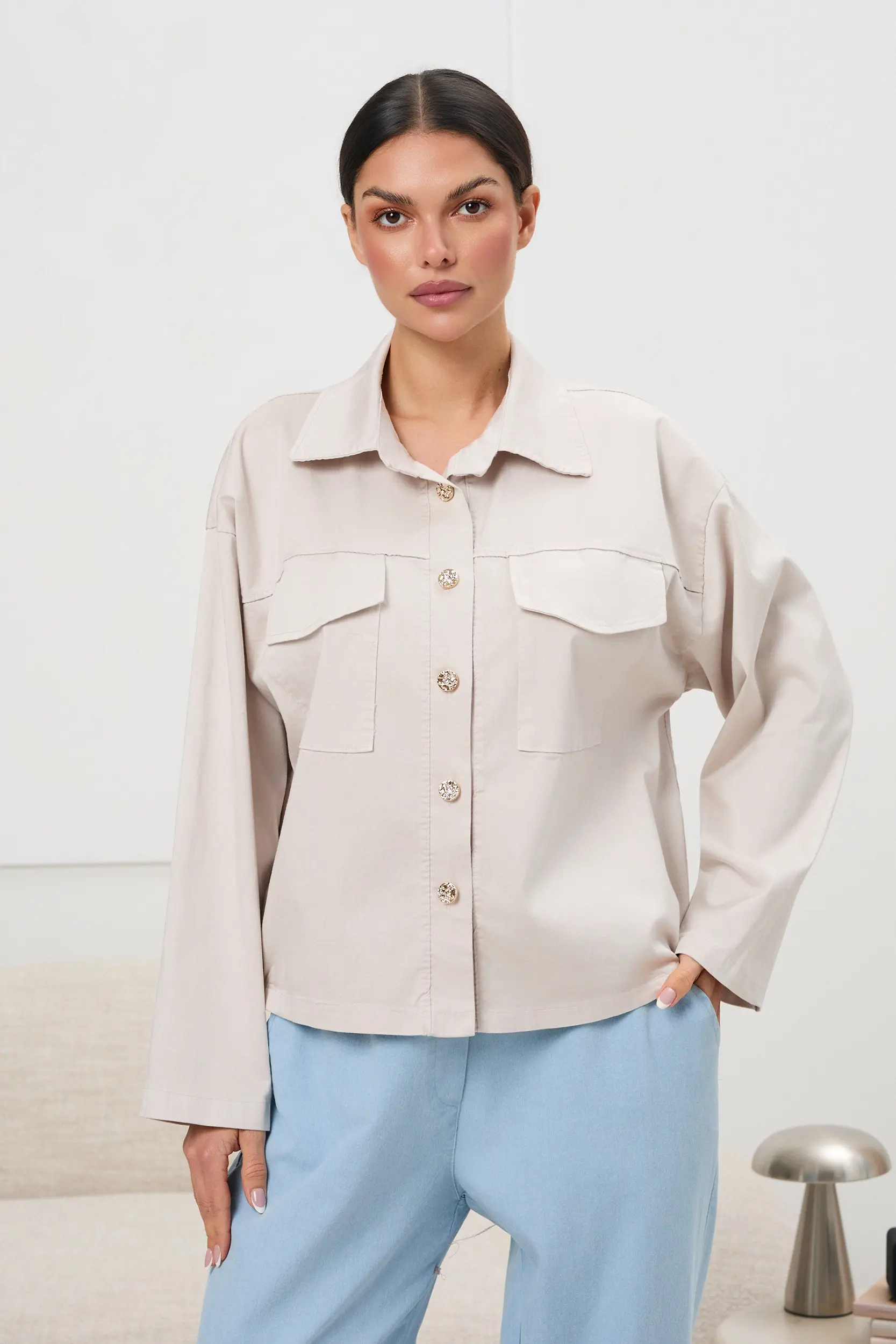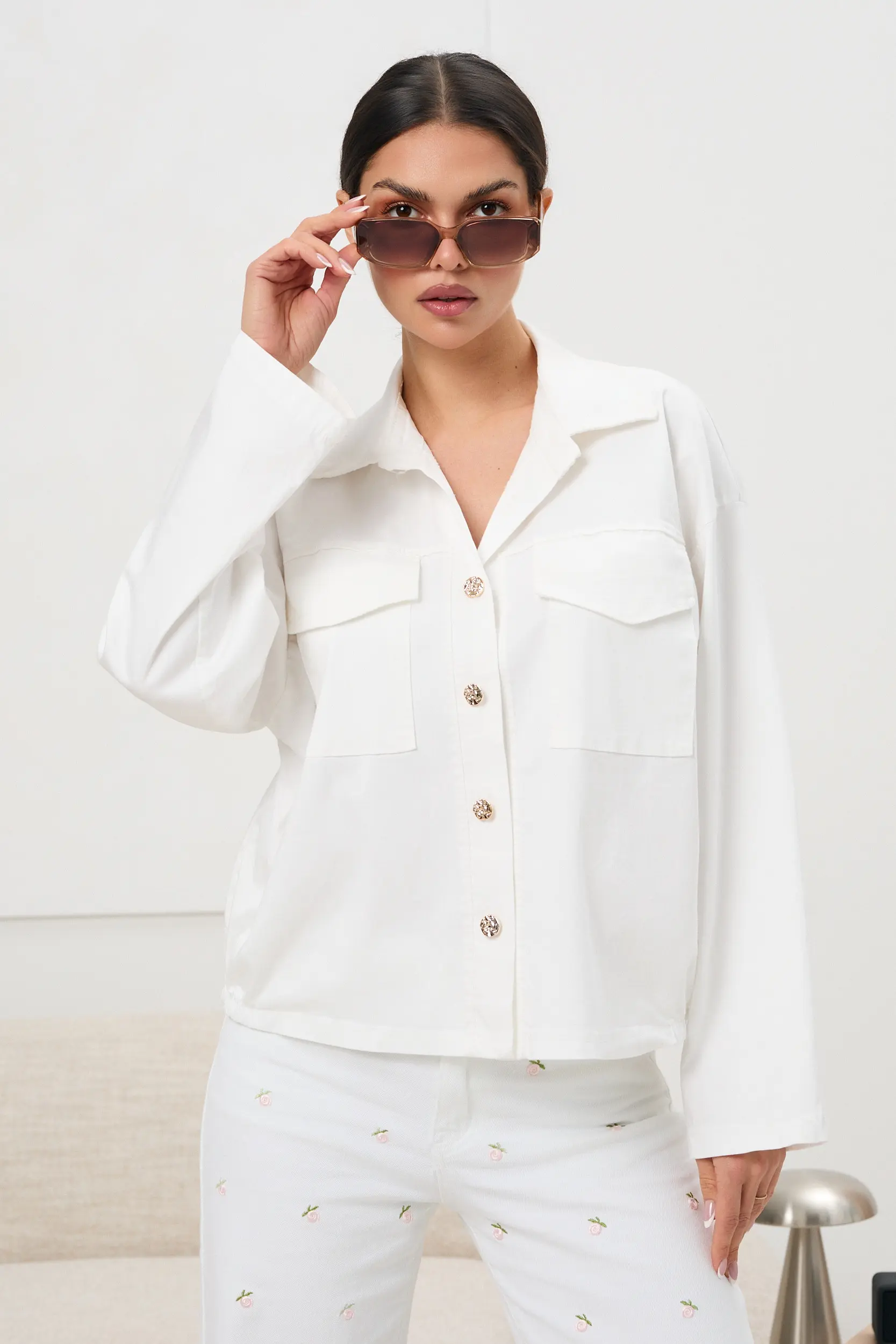 Koszula o swobodnym, lekko oversize’owym kroju. Model posiada klasyczny kołnierzyk oraz zapięcie na ozdobne guziki, które nadają jej subtelnego charakteru. Długie rękawy z obniżoną linią ramion podkreślają luźną formę, a dwie naszywane kieszenie z klapami na wysokości biustu dodają funkcjonalności. Gładka, miękko układająca się tkanina oraz proste wykończenie dołu sprawiają, że koszula prezentuje się stylowo i nowocześnie.