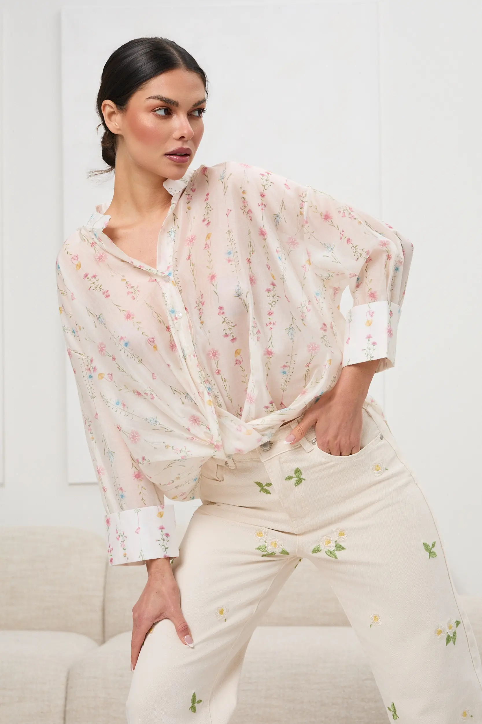 Lekka, zwiewna koszula o luźnym kroju wykonana z delikatnej, półtransparentnej tkaniny subtelnie układa się na sylwetce, zapewniając komfort i elegancję. Zdobi ją romantyczny, drobny print w pastelowe kwiaty, który nadaje całości świeżości i kobiecego charakteru. Model posiada klasyczny kołnierzyk oraz zapięcie na guziki, a szerokie rękawy zakończone są mankietami. Dół koszuli można swobodnie nosić lub związać, podkreślając jej lekkość i nowoczesny styl.