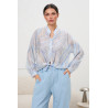 Lekka, zwiewna koszula wyróżnia się subtelnym, geometrycznym wzorem w paski, który nadaje jej nowoczesnego charakteru. Model posiada luźny, oversize’owy krój z delikatnie opuszczoną linią ramion, co zapewnia swobodę i komfort noszenia. Długie rękawy zakończone są mankietami, a klasyczny kołnierzyk i zapięcie na guziki podkreślają jej ponadczasowy styl.