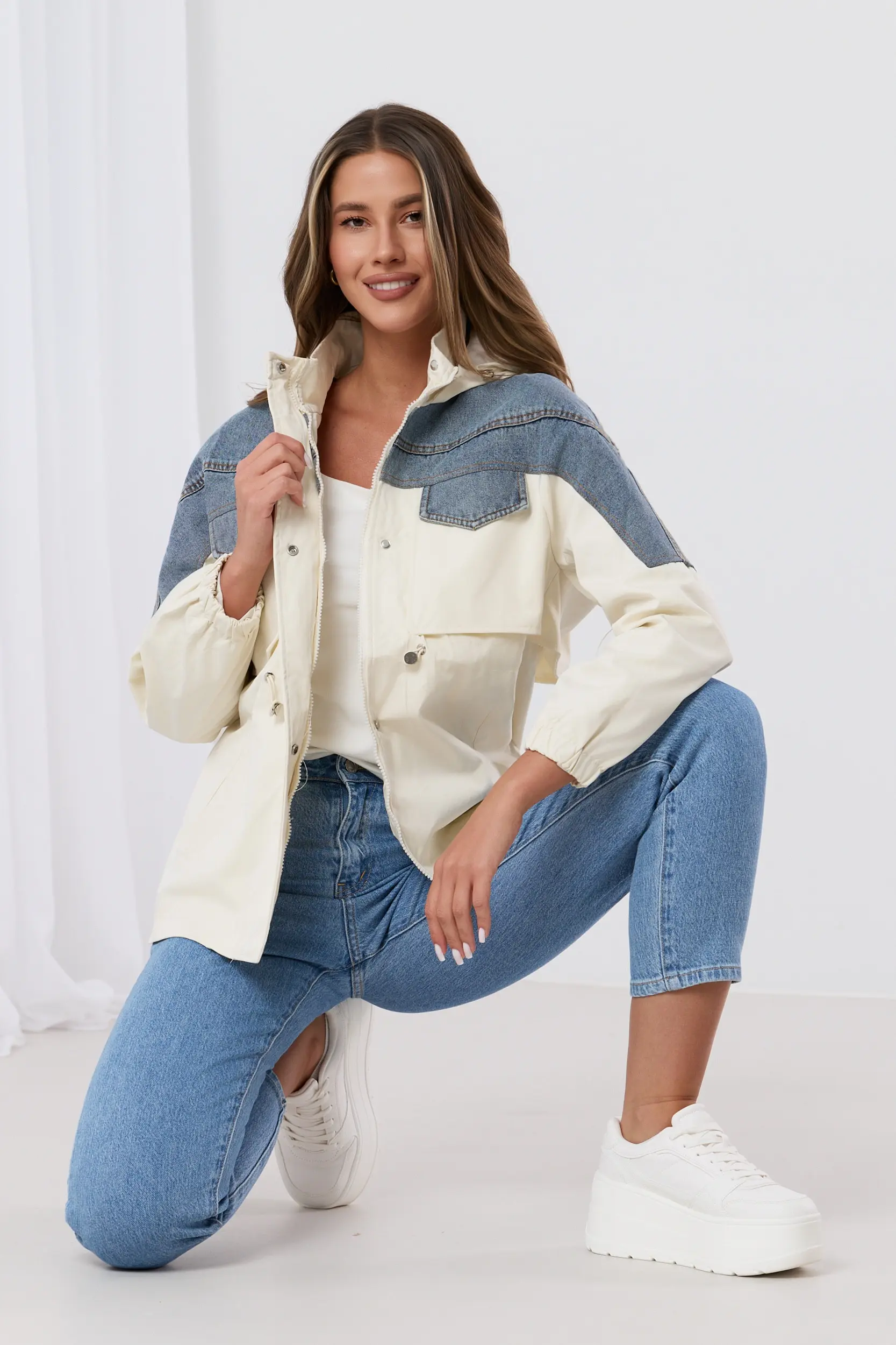 Kurtka parka o nowoczesnym kroju, która efektownie łączy dwa kontrastujące materiały. Górna część oraz rękawy zostały wykonane z klasycznego, niebieskiego jeansu, natomiast dół, przód i tył to gładka tkanina. Model posiada wysoki kołnierz, praktyczne zapięcie na suwak oraz funkcjonalne ściągacze w pasie i przy mankietach, co pozwala na idealne dopasowanie do sylwetki. Całość uzupełniają pionowe kieszenie oraz metalowe detale, tworząc idealną propozycję na sezon przejściowy w klimacie casual.