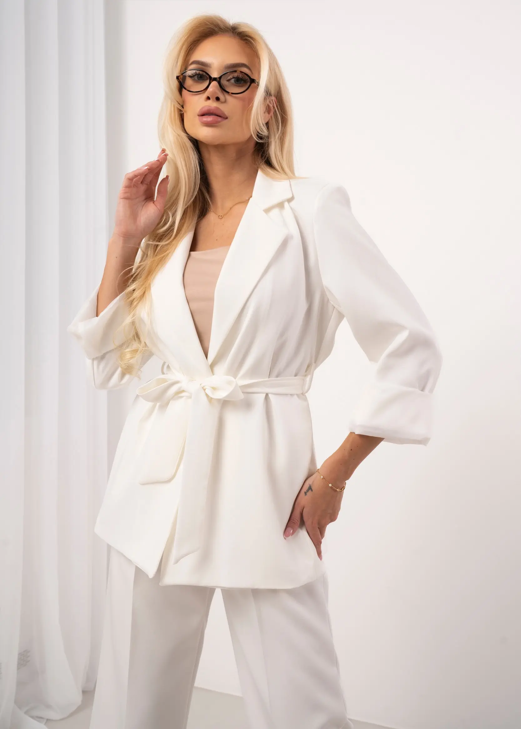 Marynarka o luźnym kroju wykonana z lejącej tkaniny. Model z kołnierzem z klapami i długim rękawem z możliwością podwinięcia. Odcinana w pasie z wiązaniem na pasek z tego samego materiału, który efektownie podkreśla talię i nadaje sylwetce kobiecy kształt. Brak zapięcia z przodu dodaje projektowi nowoczesnej lekkości. Minimalistyczne wykończenie i gładka struktura materiału sprawiają, że idealnie sprawdzi się zarówno w eleganckich zestawach ze spodniami do kompletu, jak i w casualowych stylizacjach z jeansami.