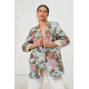 Marynarka o klasycznym, lekko oversize’owym kroju zachwyca wyrazistym, kwiatowym wzorem, który nadaje stylizacji świeżości i elegancji. Model posiada głęboki dekolt w kształcie litery V z klasycznymi klapami, zapinany jest na jeden guzik w dopasowanym kolorze, co podkreśla talię i wysmukla sylwetkę. Rękawy podwinięte o długości 3/4 wykończone są gładką podszewką w jasnym odcieniu, tworząc efektowny kontrast. Starannie wykończona tkanina o lekko strukturalnej fakturze dodaje całości szlachetnego charakteru, a subtelne kieszenie z przodu podkreślają funkcjonalność fasonu.