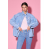 Jeansowa kurtka o luźnym, oversize’owym kroju z efektem delikatnego sprania, wyróżnia się modnymi przetarciami oraz dekoracyjnymi aplikacjami w kształcie serc z kontrastową, różową lamówką, umieszczonymi z przodu i na plecach. Model zapinany na metalowe guziki, z klasycznym kołnierzem i długimi rękawami zakończonymi mankietami na guzik, zapewnia swobodę stylizacji i komfort noszenia. Kurtka posiada obniżoną linię ramion, co podkreśla jej casualowy charakter, a ozdobne detale nadają całości kobiecego, oryginalnego akcentu, idealnego do codziennych i streetwearowych stylizacji.