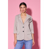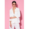 Elegancka marynarka o klasycznym, lekko taliowanym kroju, wykonana z gładkiej, przyjemnej w dotyku dzianiny, która dobrze układa się na sylwetce. Model zapinany na dwa guziki, z klasycznym kołnierzem i dekoltem w kształcie litery V, optycznie wysmuklającym szyję. Rękawy o długości 3/4 z delikatnym podwinięciem nadają całości nowoczesnego i lekkiego charakteru. Na piersi umieszczona jest efektowna, materiałowa aplikacja w formie kwiatu, która stanowi kobiecy akcent i wyróżnia marynarkę na tle klasycznych modeli. Dwie naszywane kieszenie z przodu podkreślają casualowo-elegancki styl, dzięki czemu marynarka doskonale sprawdzi się zarówno w stylizacjach biurowych, jak i bardziej codziennych.