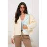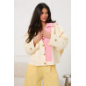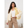 Krótka kurtka o nowoczesnym, minimalistycznym fasonie zachwyca modnym połączeniem pastelowych kolorów, które nadają stylizacji lekkości i świeżości. Model o luźnym, lekko oversize’owym kroju zapewnia swobodę ruchów i komfort noszenia, a szeroki kołnierz z klapami dodaje jej eleganckiego charakteru. Kurtka zapinana jest na duże, ozdobne guziki w złotym odcieniu, które stanowią stylowy akcent i podkreślają dopracowane detale. Długie rękawy zakończone są mankietami z dekoracyjnymi guzikami, co nadaje całości spójny i wyrafinowany wygląd. Gładki materiał o miękkim wykończeniu sprawia, że model doskonale sprawdzi się jako lekka kurtka przejściowa – idealna na wiosnę i chłodniejsze letnie dni.