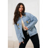 Kurtka jeansowa o luźnym, lekko oversize’owym kroju wykonana z wysokiej jakości denimu, zapinana na metalowe napy, z klasycznym kołnierzem i długimi rękawami zakończonymi mankietem, posiada dwie naszywane kieszenie na piersi oraz boczne kieszenie wsuwane, a jej wyjątkowy charakter podkreślają efektowne, ręcznie aplikowane, wielokolorowe zdobienia w formie kwiatów z cekinów, koralików i kryształków rozmieszczone na kołnierzu, klapach kieszeni i przodzie kurtki, które nadają całości kobiecego, biżuteryjnego akcentu i sprawiają, że klasyczny fason zyskuje modowy, oryginalny wygląd idealny do stylizacji casualowych i smart-casual.