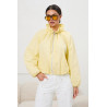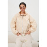 Lekka kurtka o krótszym fasonie z wygodnym zapięciem na suwak na całej długości, wykończona wysoką stójką z możliwością regulacji za pomocą troczków. Model posiada luźny, swobodny krój oraz delikatnie opuszczoną linię ramion, co zapewnia komfort noszenia. Rękawy zakończone elastycznymi mankietami chronią przed wiatrem, a dół z subtelnym marszczeniem nadaje sylwetce lekkości. Gładka tkanina prezentuje się nowocześnie i sprawdzi się zarówno w codziennych, jak i sportowych stylizacjach.