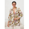 Marynarka o luźniejszym, lekko oversize’owym kroju, wykonana z tkaniny o wyrazistej, gobelinowej strukturze. Jasne tło przełamane jest wielobarwnym wzorem z motywem misiów, co nadaje jej oryginalny, artystyczny charakter. Model posiada klasyczne klapy, jednorzędowe zapięcie na guzik oraz podwinięte rękawy z jasną podszewką. Fason subtelnie podkreśla sylwetkę, łącząc szyk z nutą nowoczesnej swobody i wyjątkowego stylu.