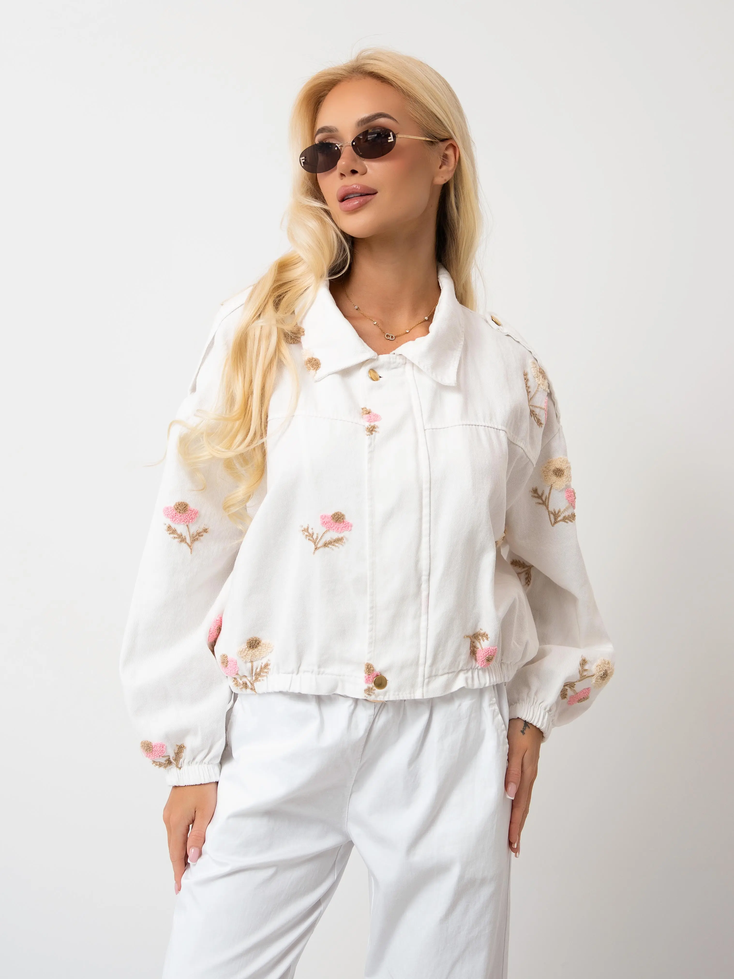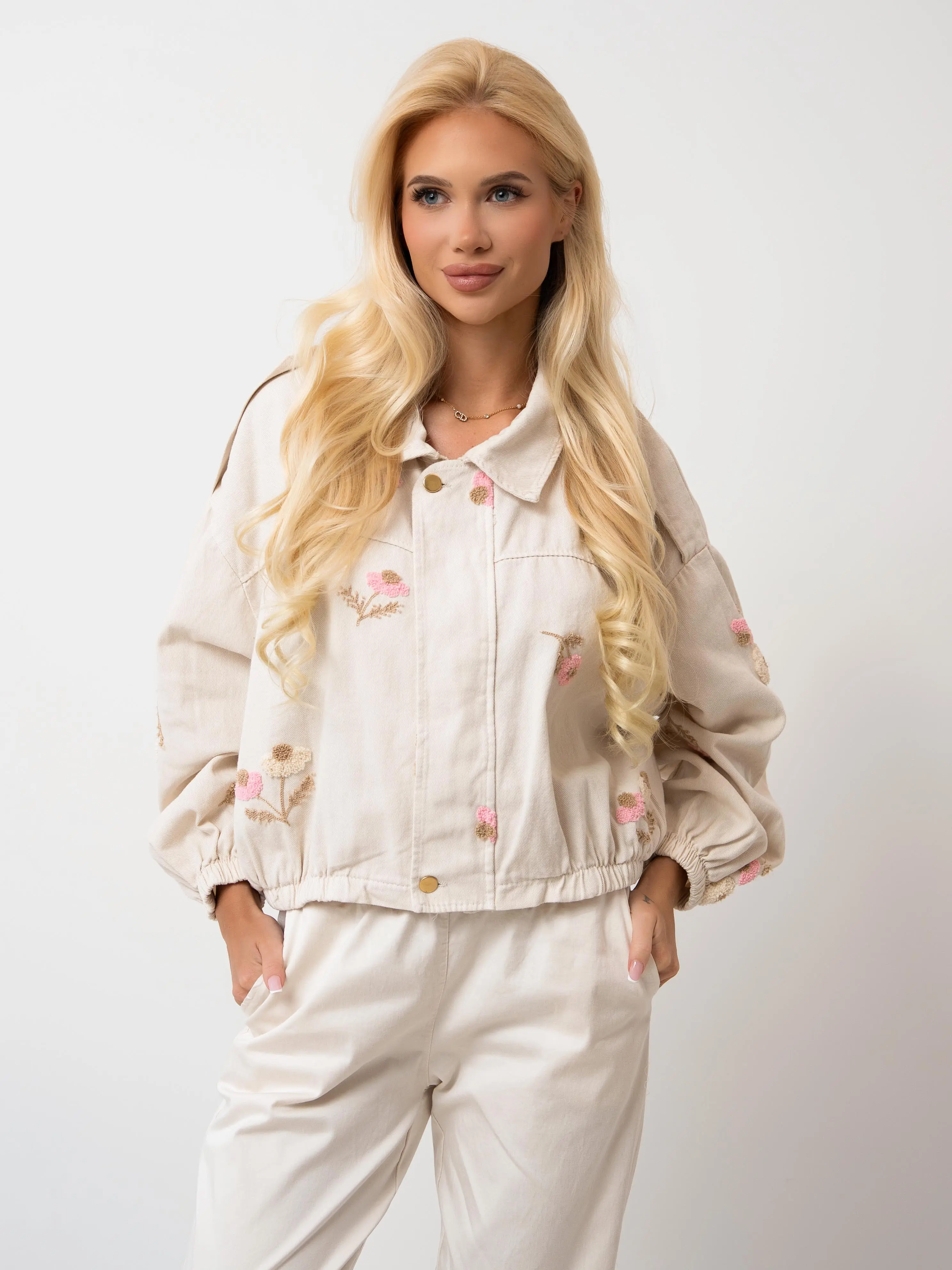 Kurtka typu bomberka to idealne połączenie swobody i kobiecego wdzięku. Wykonana z wysokiej jakości tkaniny o subtelnej strukturze, charakteryzuje się luźnym krojem z obniżoną linią ramion oraz szerokimi rękawami zakończonymi elastycznymi ściągaczami. Wyjątkowego charakteru nadają jej wypukłe, haftowane aplikacje kwiatowe w odcieniach różu i kremu. Model posiada klasyczny kołnierzyk, praktyczne zapięcie na złote napy oraz marszczenie na dole, które podkreśla sylwetkę.