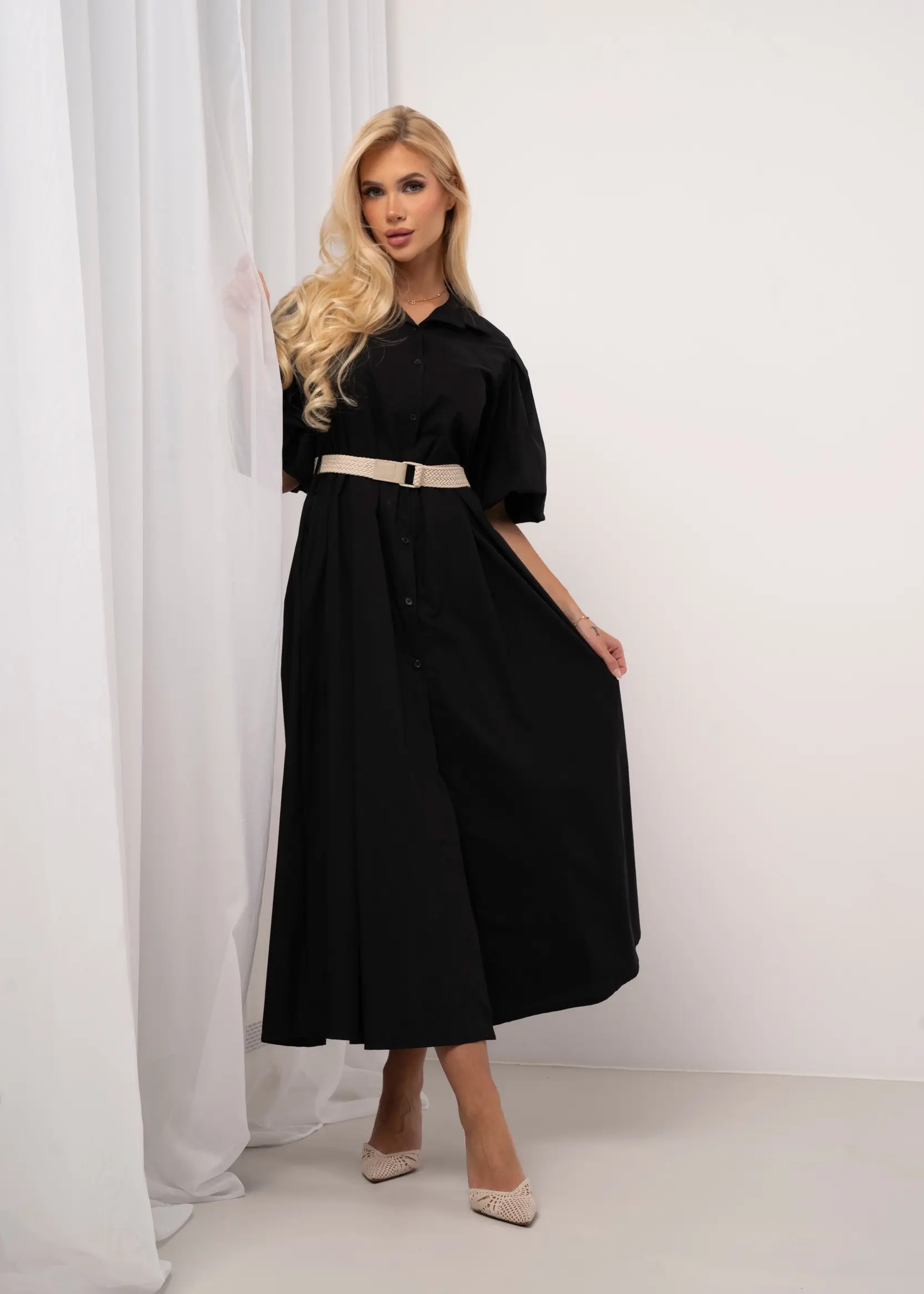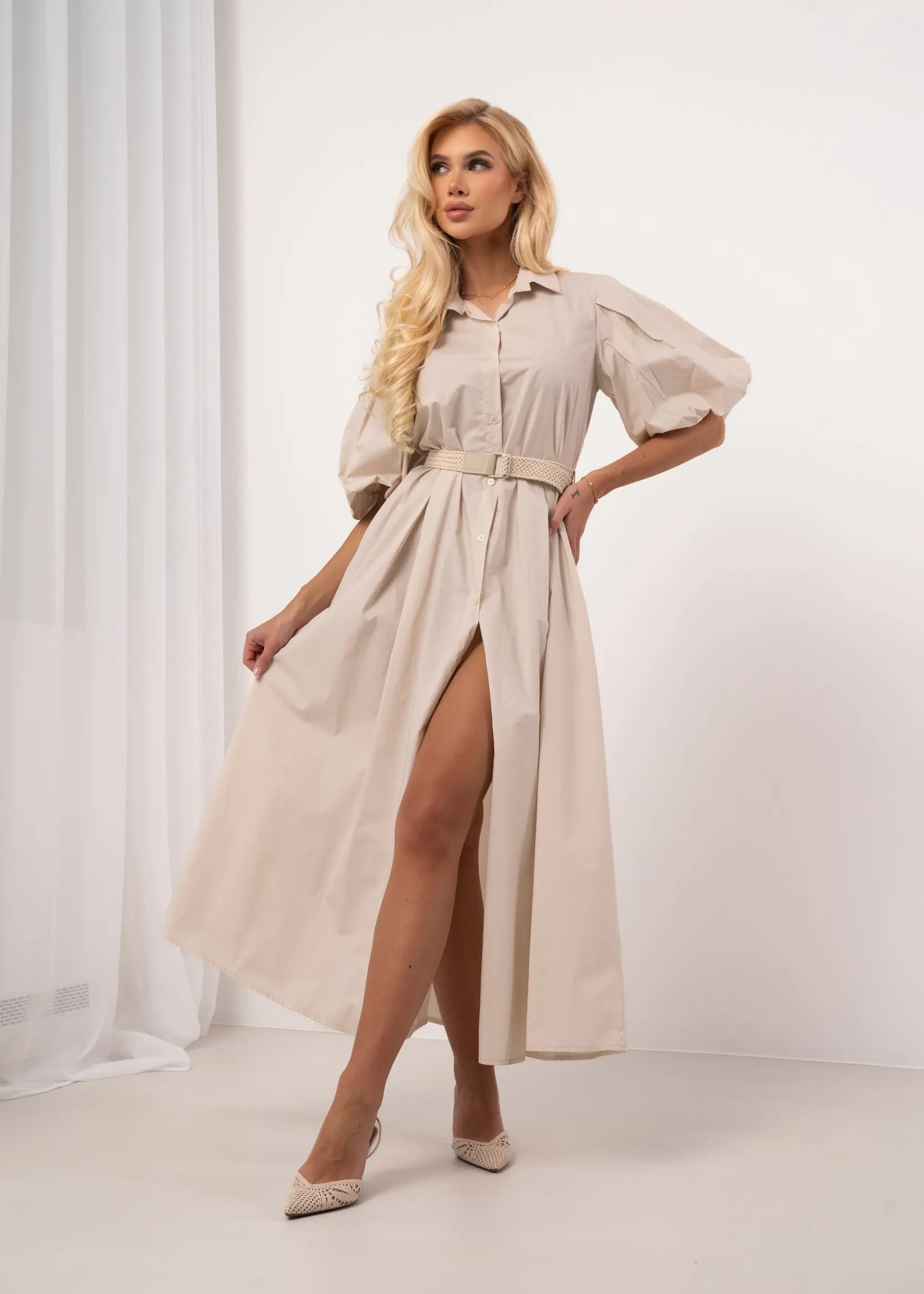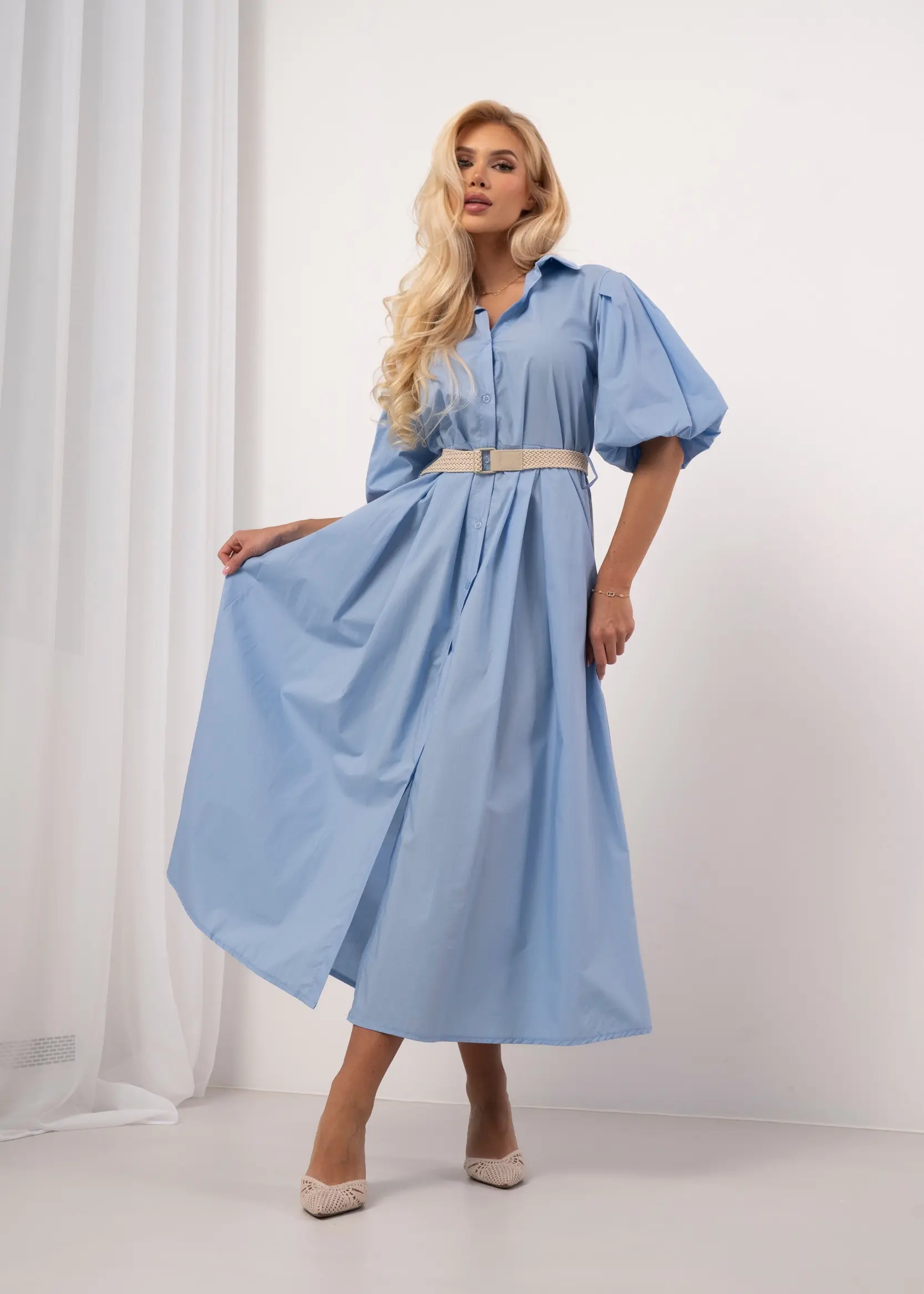 Sukienka koszulowa o długości midi, wykonana z lekkiej tkaniny. Model o luźnym kroju z klasycznym kołnierzykiem i zapięciem na guziki z przodu, które pozwala na regulację głębokości rozcięcia. Uwagę zwracają efektowne, bufiaste rękawy o długości do łokcia, wykończone elastycznym marszczeniem, które nadają sylwetce nowoczesną formę. W talii znajduje się pleciony pasek z ozdobną klamrą, idealnie podkreślający figurę.