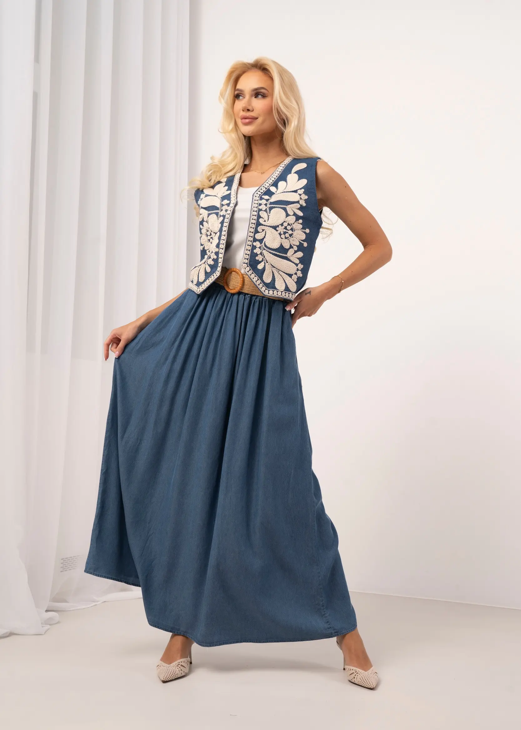 Długa spódnica o luźnym kroju, wykonana z miękkiej tkaniny o strukturze denimu. Wysoki stan z elastycznym marszczeniem w pasie zapewnia komfort i idealne dopasowanie. Szeroki dół o linii A nadaje sylwetce lekkości. W zestawie znajduje się pleciony pasek z ozdobną klamrą, który podkreśla talię. Minimalistyczny design sprawia, że jest to uniwersalna baza do stylizacji codziennych i w klimacie boho.