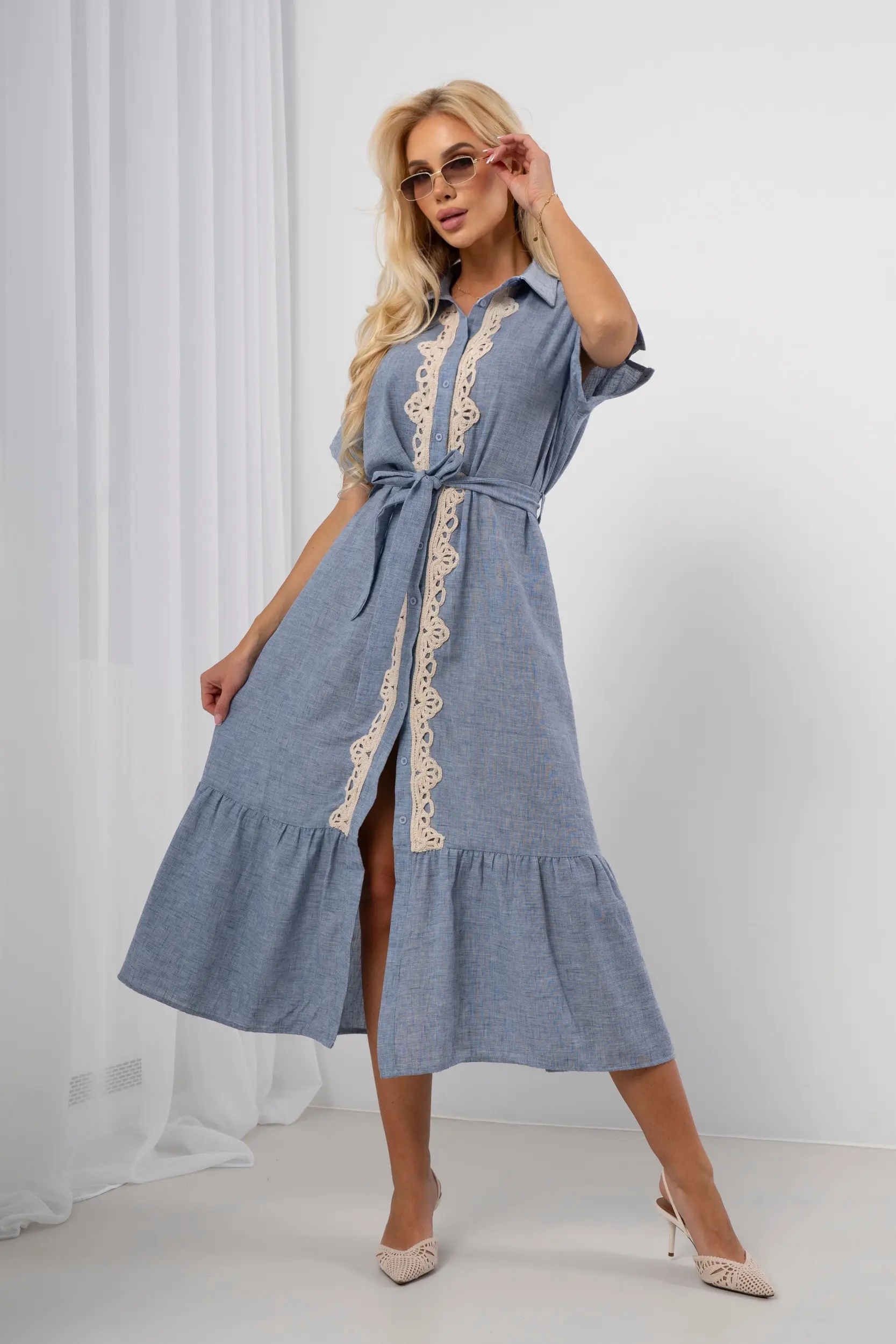 Sukienka koszulowa o długości midi wykonana z lekkiej tkaniny o wyraźnym splocie. Model z kołnierzykiem i krótkim rękawem. Odcięcie w pasie z wiązanym paskiem z tego samego materiału pozwala na idealne dopasowanie do sylwetki i podkreślenie talii. Przód ozdobiony szeroką, ażurową lamówką z gipiurowym haftem o kwiatowym motywie, biegnącą wzdłuż zapięcia na guziki. Dół wykończony szeroką falbaną nadającą całości objętości i subtelnego ruchu. Klasyczny fason łączący elegancję z naturalnym, letnim stylem.
