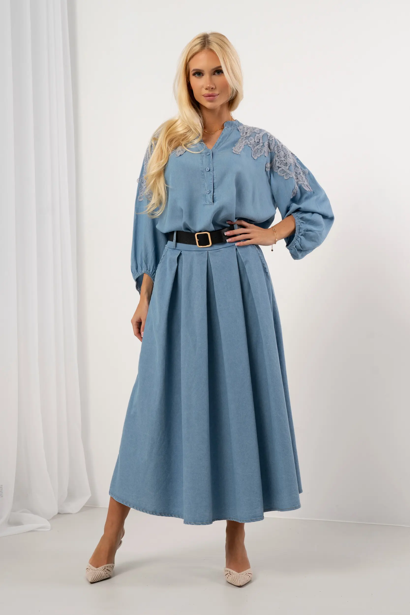 Spódnica o długości maxi wykonana z miękkiej tkaniny z wysokim stanem podkreślonym szerokim, kontrastowym paskiem z ozdobną klamrą. Przód z zaznaczonymi kontrafałdami, które nadają całości efektowną objętość i swobodny ruch. Rozkloszowany krój typu „A” zapewnia komfort noszenia i elegancką sylwetkę. Starannie wykończony dół z delikatnym przeszyciem. Idealna propozycja do minimalistycznych zestawień z dopasowanym body lub zwiewną bluzą.
