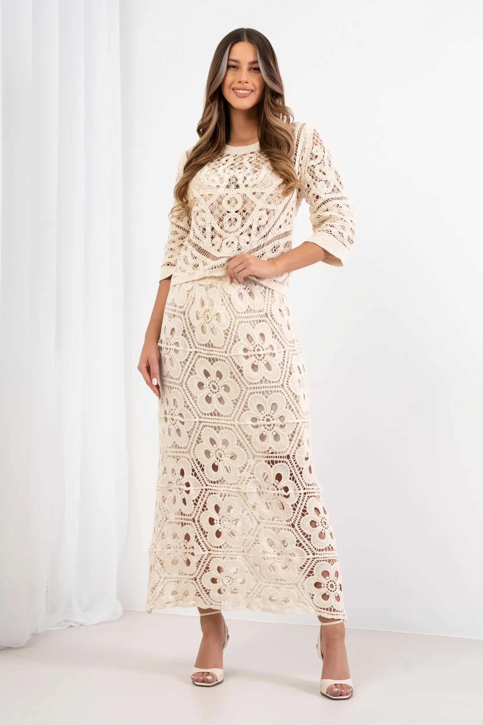 Spódnica maxi o prostym kroju, wykonana z ażurowej dzianiny z kunsztownym motywem roślinnym. Wysoki stan z elastycznym pasem zapewnia idealne dopasowanie i komfort noszenia. Model wyróżnia się geometrycznym układem wypukłych haftów tworzących efektowne prześwity, co nadaje sylwetce lekkości. Dół wykończony subtelnym splotem.