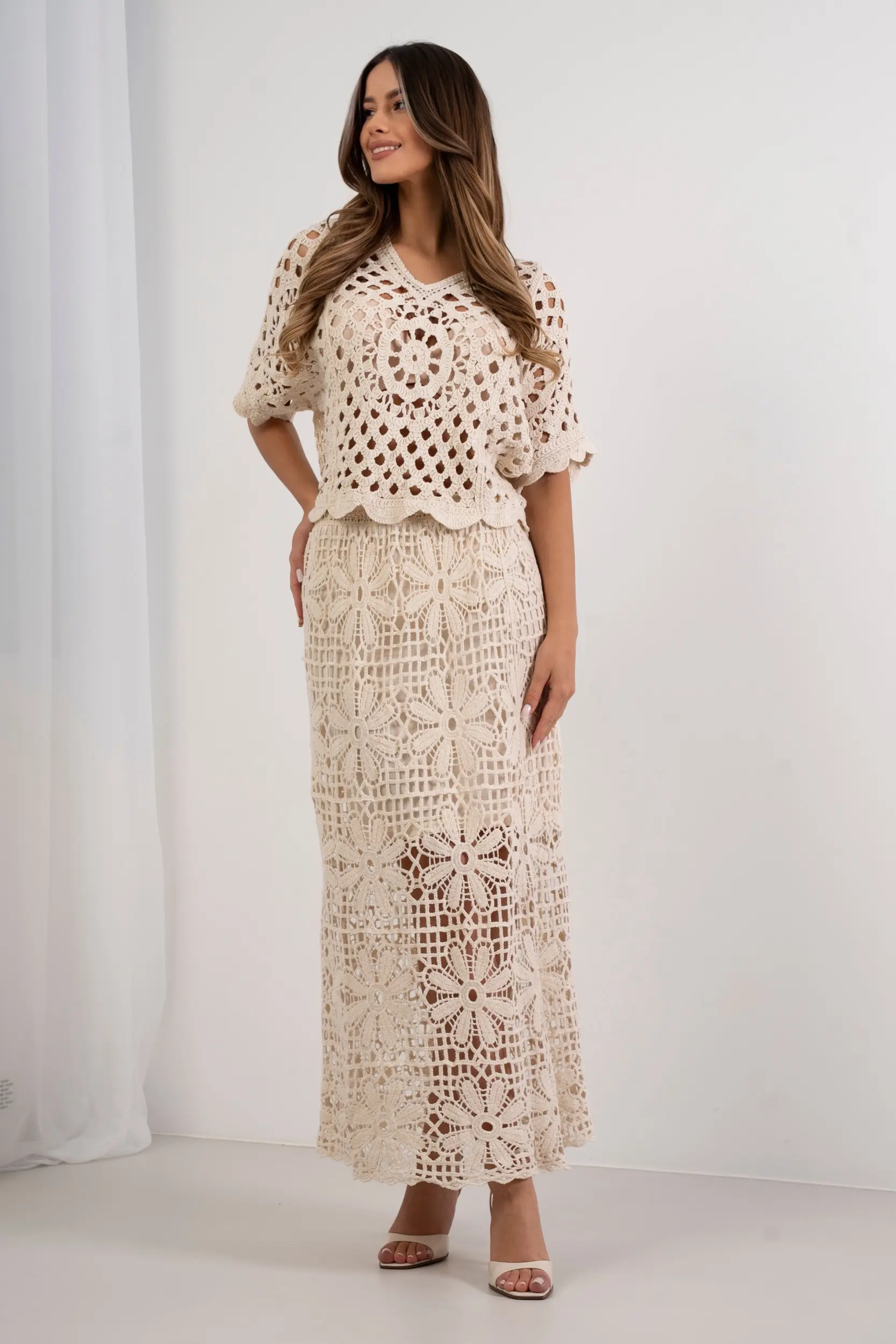 Spódnica długa o ażurowym splocie wykonana z wysokiej jakości dzianiny z efektem szydełkowym. Model o prostym kroju z podwyższonym stanem, który podkreśla sylwetkę, zapewniając jednocześnie pełną swobodę ruchów. Elastyczny pas w talii gwarantuje idealne dopasowanie i komfort noszenia przez cały dzień. Wyrazisty, kwiatowy motyw rozmieszczony na całej długości nadaje całości unikalnego, rzemieślniczego charakteru w stylu boho chic. Spódnica posiada krótką podszewkę, która zapewnia odpowiednie krycie, eksponując subtelną transparentność dołu. Brzegi wykończone dekoracyjnym splotem dodają elegancji i lekkości. Idealna propozycja do letnich stylizacji.