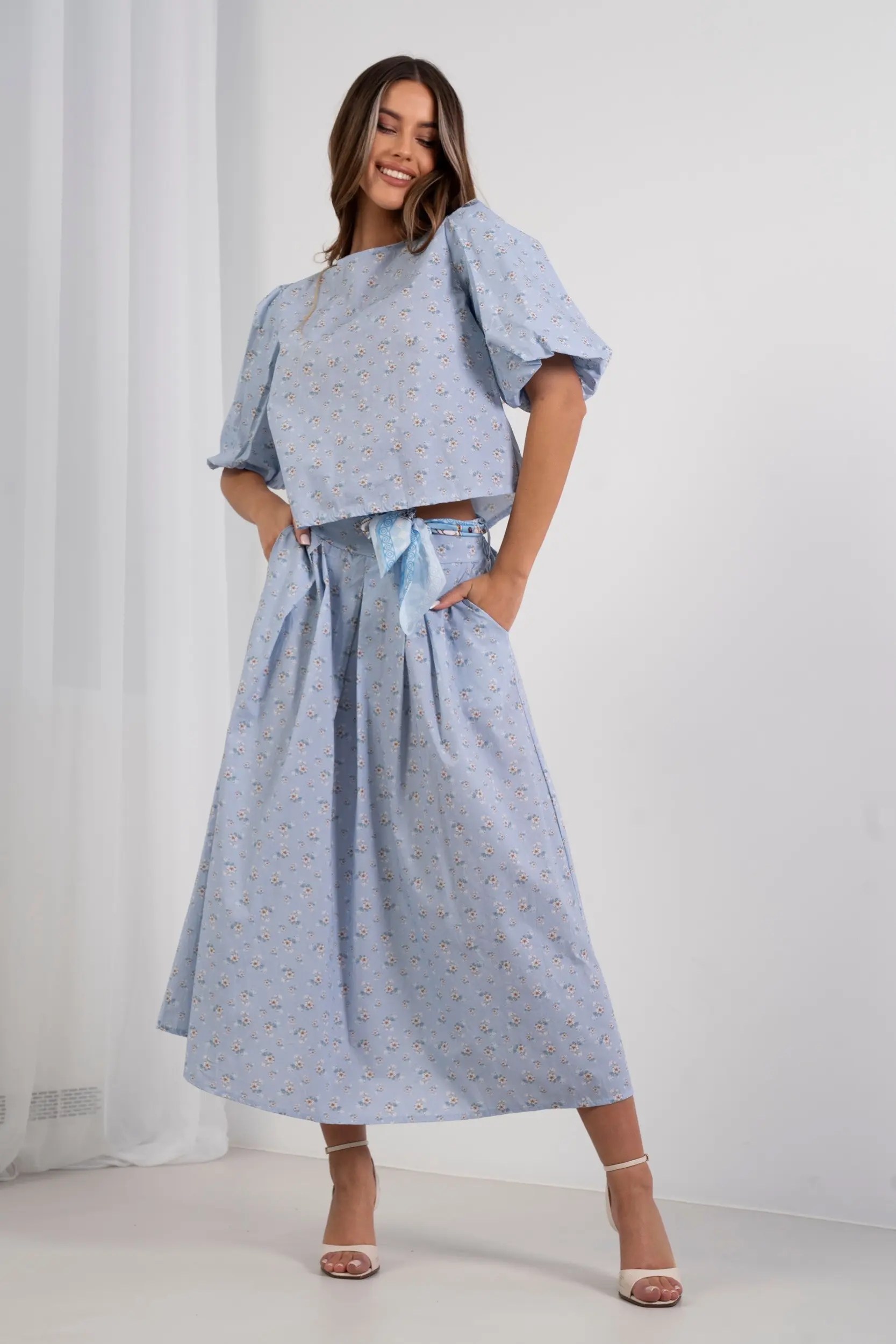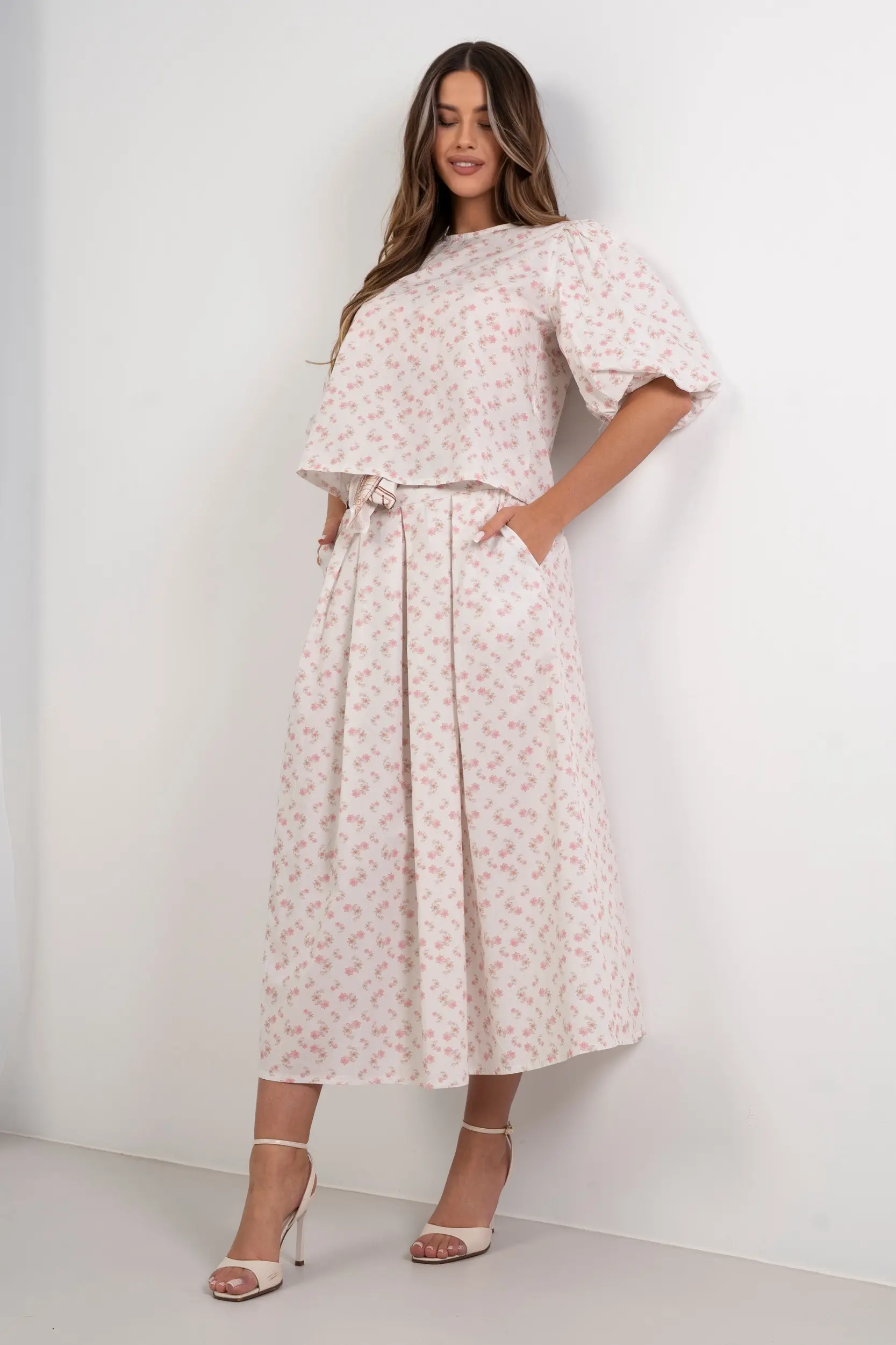 Spódnica maxi o rozkloszowanym kroju, wykonana z lekkiej tkaniny z subtelnym nadrukiem w drobne kwiatuszki na całej powierzchni. Model z wysokim stanem podkreślonym szerokimi kontrafałdami, które nadają całości efektowną objętość i strukturę. W pasie znajdują się szlufki z ozdobnym, wiązanym pasem z tkaniny o kontrastowym wzorze, dodającym sylwetce nowoczesnego charakteru. Wykończenie z dbałością o detale sprawia, że jest to idealna propozycja do letnich zestawów.