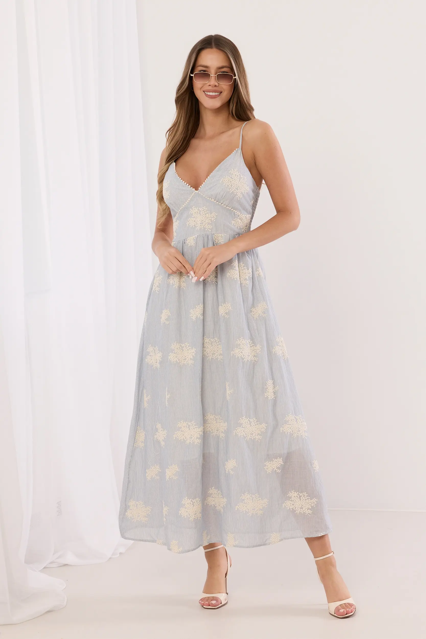 Sukienka maxi o delikatnie rozkloszowanym fasonie, wykonana z lekkiej tkaniny o subtelnej teksturze. Model na cienkich ramiączkach z kobiecym dekoltem w serek wykończonym ozdobną lamówką. Dopasowana góra płynnie przechodzi w swobodny dół, tworząc sylwetkę pełną lekkości. Całość zdobią rozsiane regularnie, wypukłe haftowane aplikacje o organicznym kształcie, nadające kreacji unikalny charakter. Idealna propozycja łącząca swobodę z wyrafinowanym stylem.