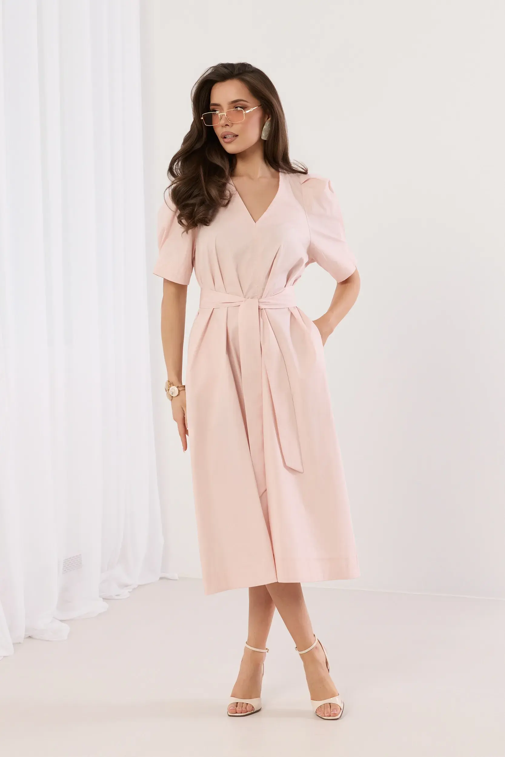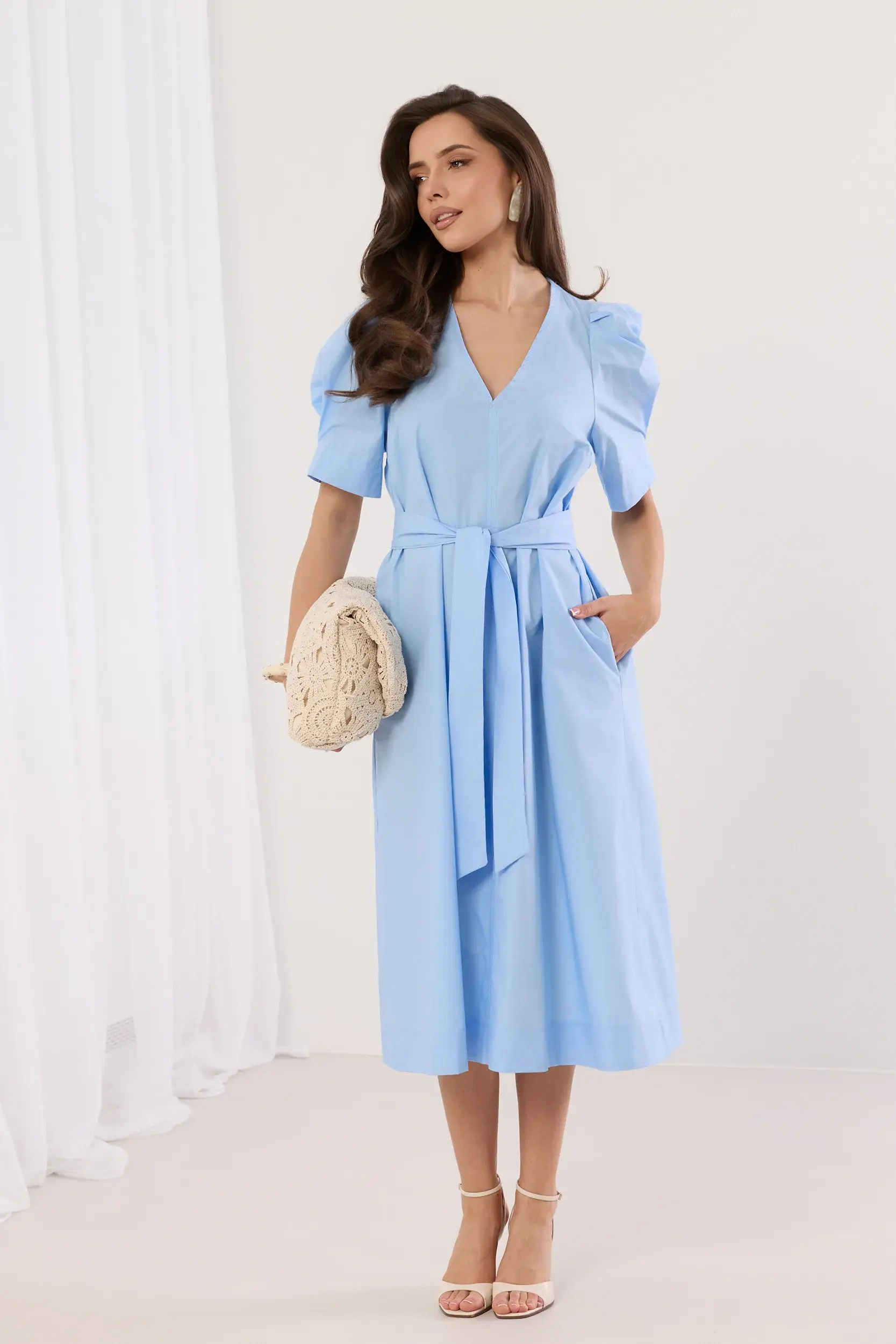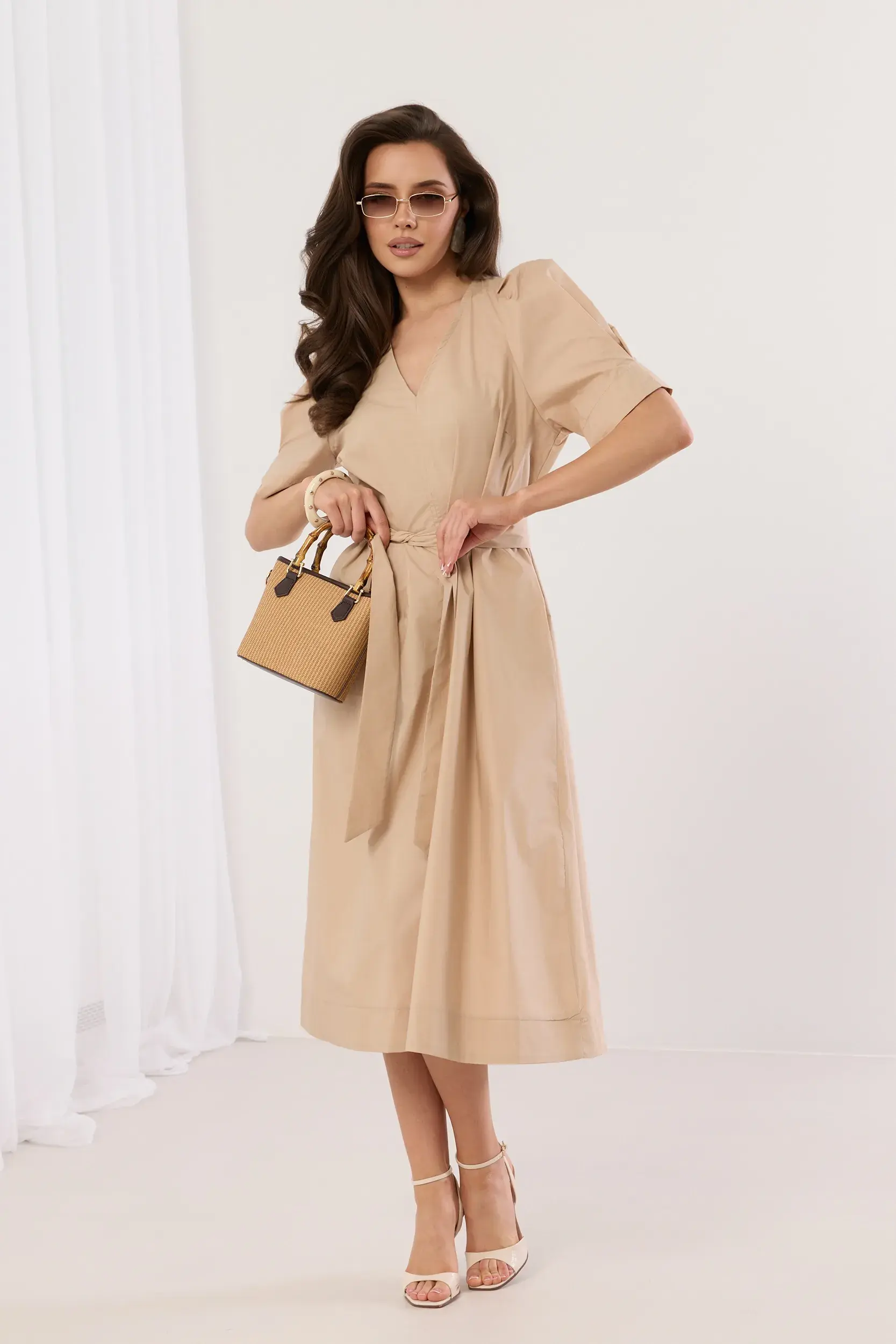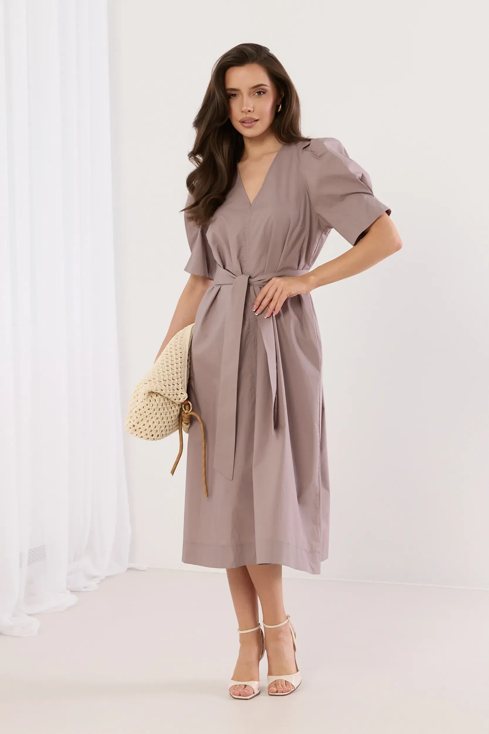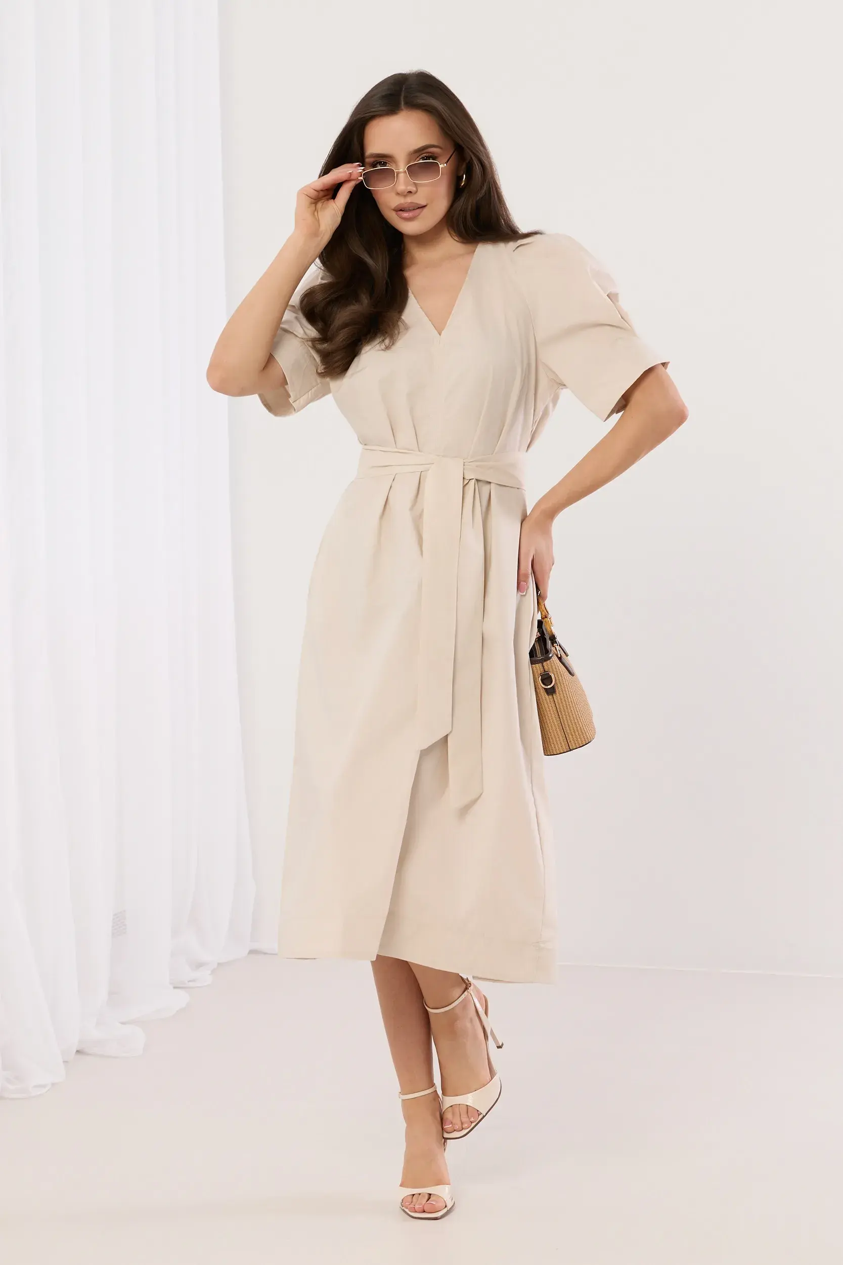 Sukienka midi o kopertowym fasonie z dekoltem w serek oraz krótkim, bufiastym rękawem zakończonym subtelnym przeszyciem. Odcięcie w talii z szerokim pasem do wiązania, który pozwala na idealne dopasowanie do sylwetki i podkreślenie talii. Rozkloszowany dół o surowym wykończeniu nadaje całości nowoczesnego charakteru. Minimalistyczny design łączący elegancję z codzienną wygodą. Idealna propozycja do letnich stylizacji z sandałami na obcasie.