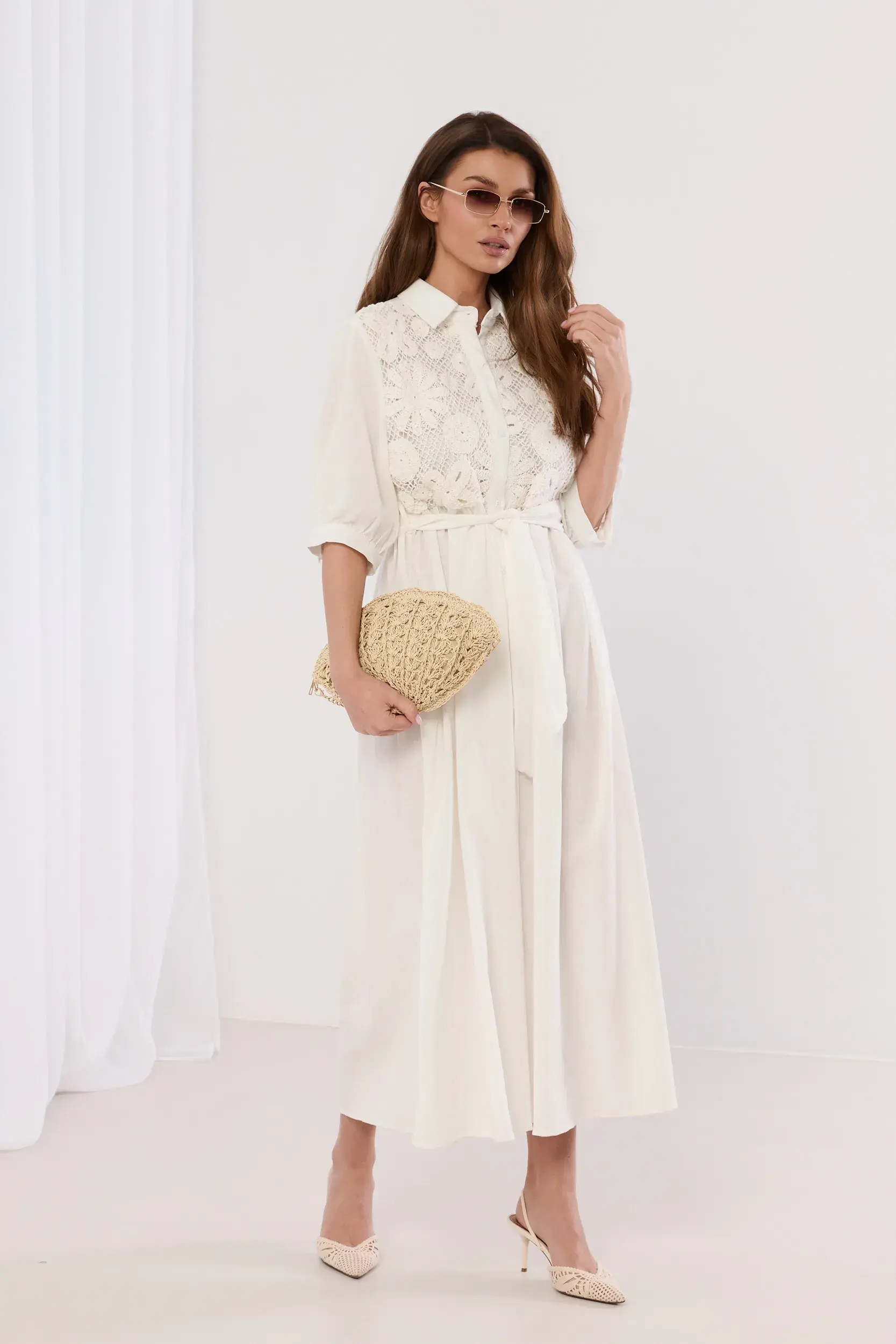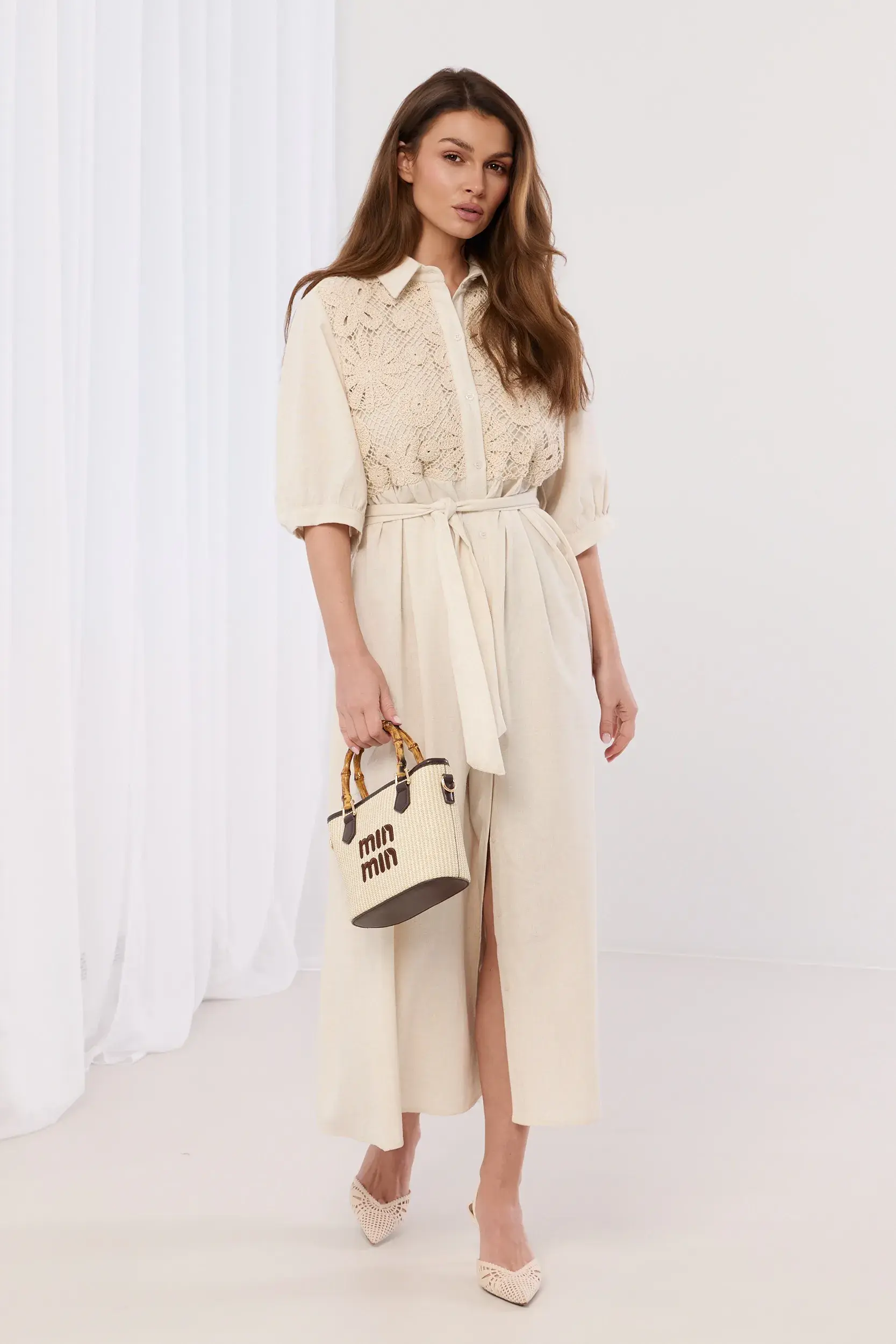 Sukienka midi o koszulowym kroju wykonana z przewiewnej tkaniny z domieszką lnu. Model z kołnierzykiem i rękawami o długości do łokcia zakończonymi gumką. Wyjątkowy charakter nadaje ozdobny panel z ażurowym haftem i kwiatowymi motywami umieszczony z przodu. Odcięcie w pasie z dopasowanym materiałowym paskiem umożliwia podkreślenie sylwetki. Rozkloszowany dół z rozcięciem z przodu zapewnia swobodę ruchów. Zapięcie na guziki ukryte pod plisą. Idealna propozycja łącząca rustykalny styl z nowoczesną elegancją.