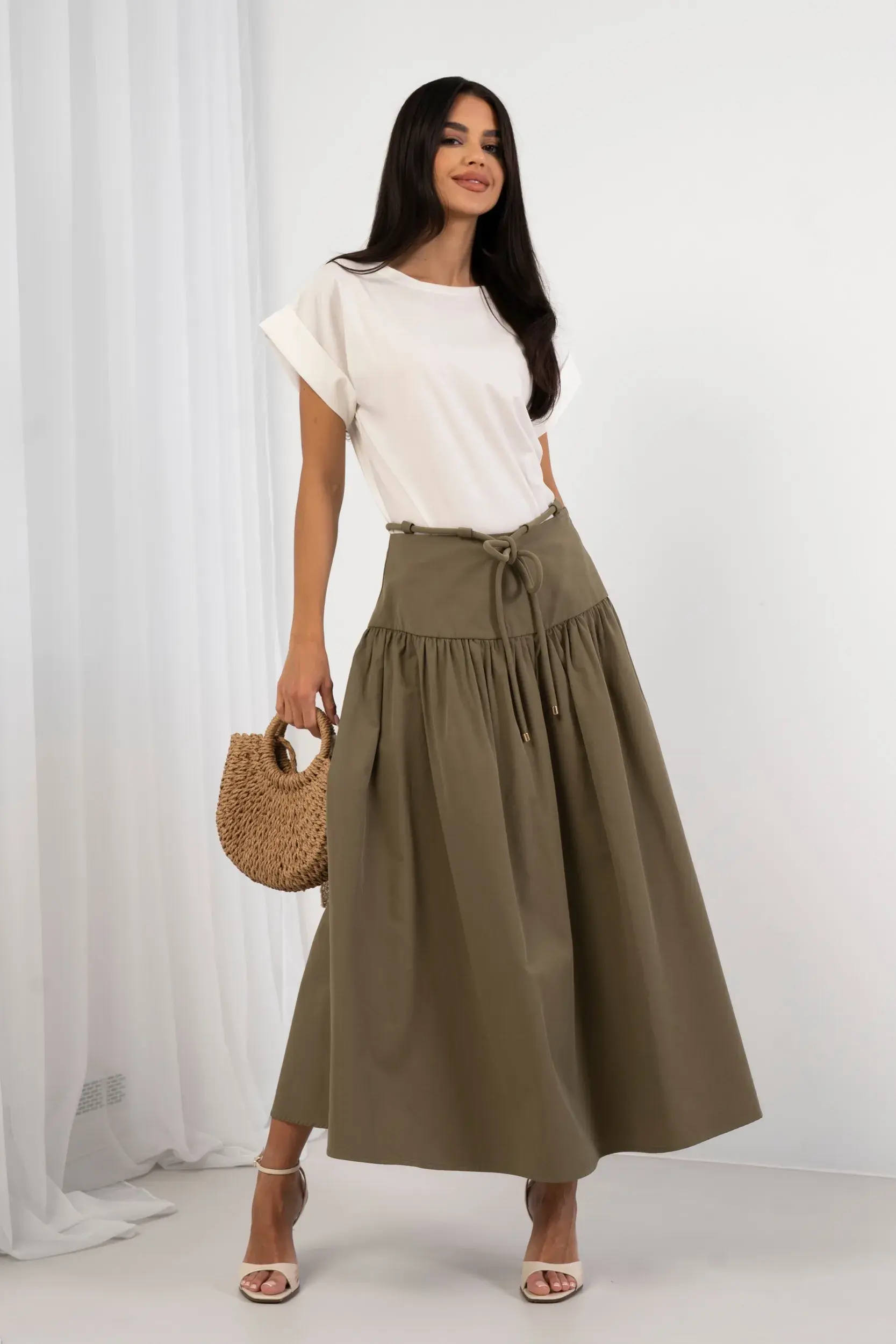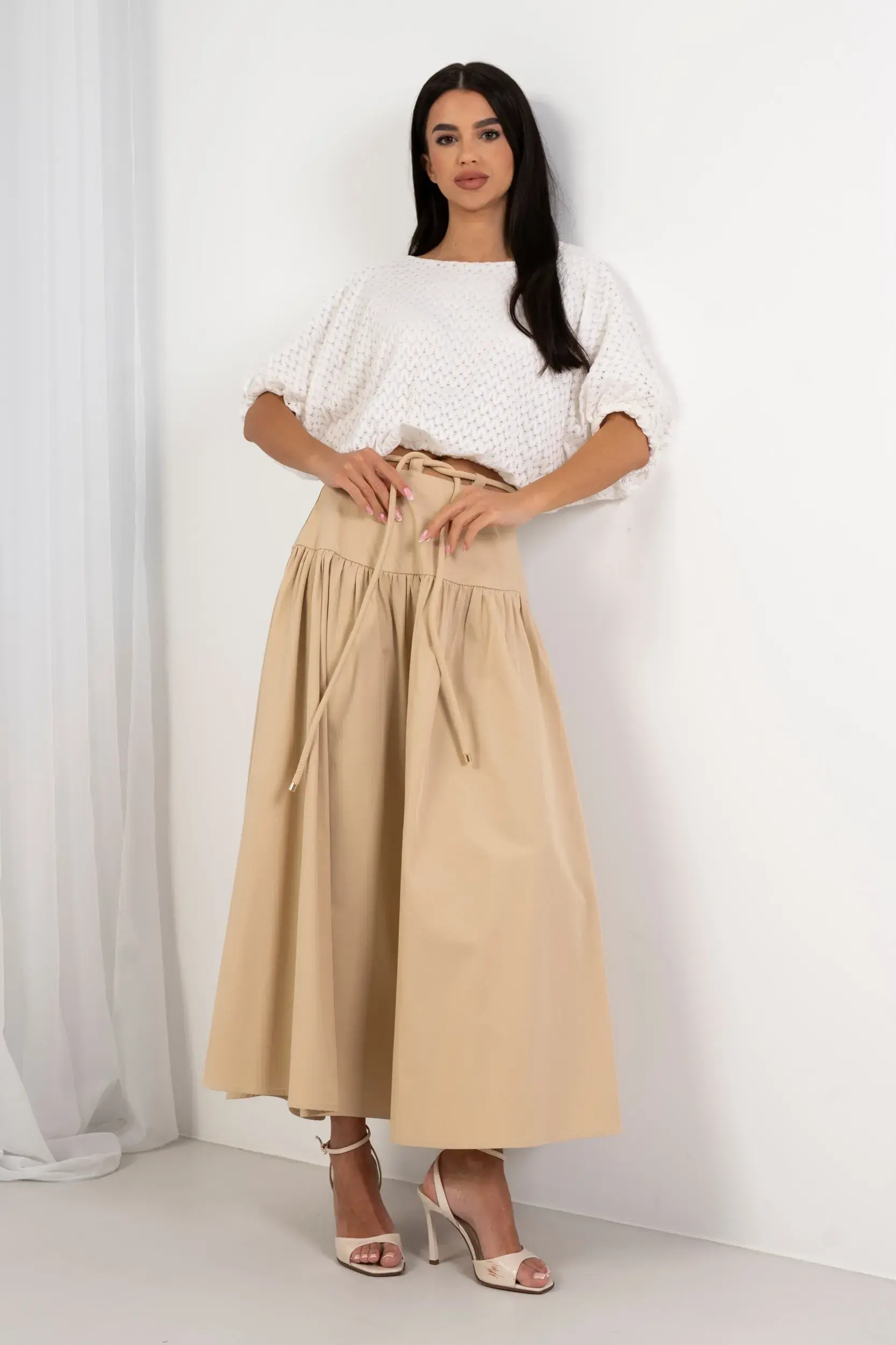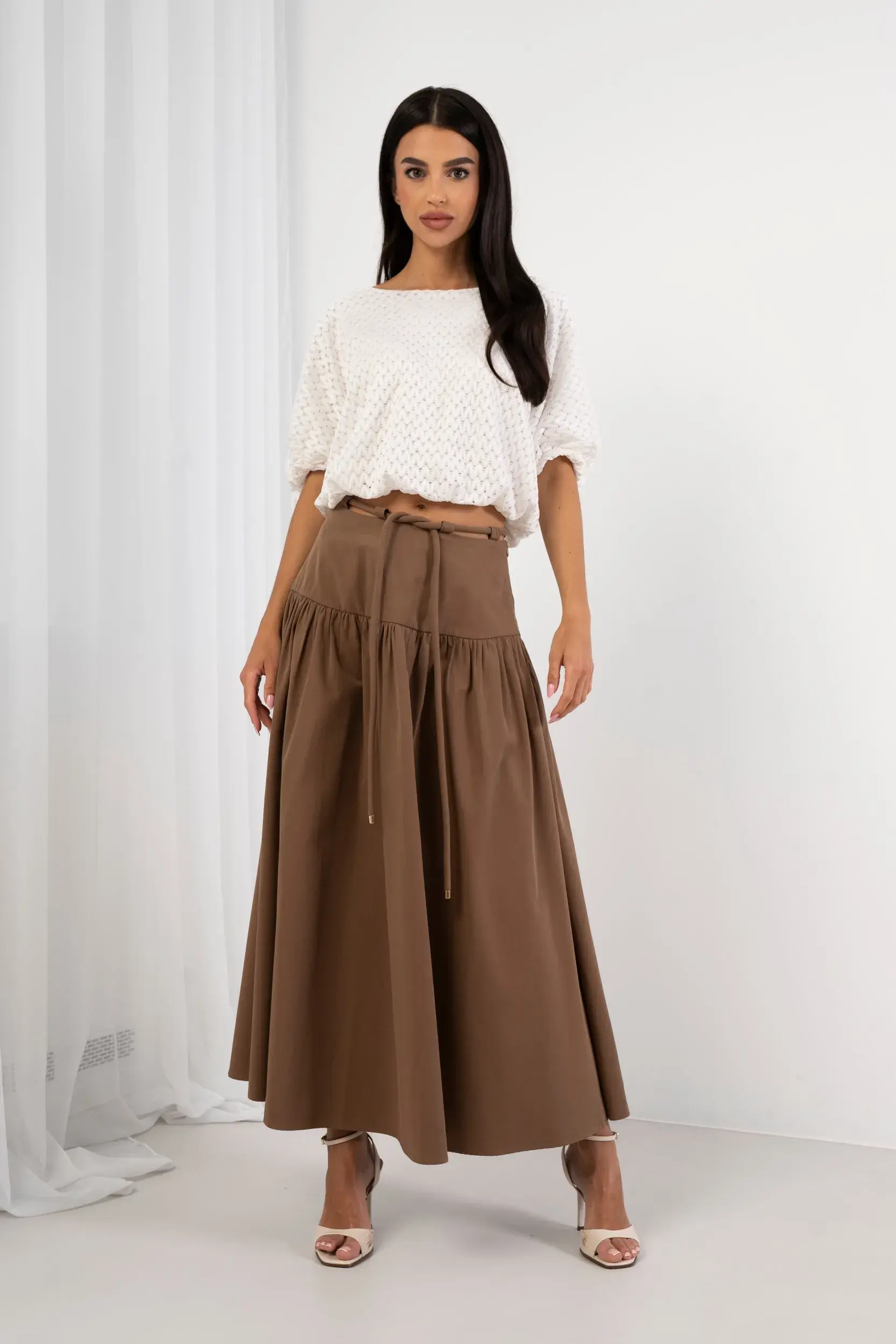 Długa spódnica o rozkloszowanym kroju wykonana z wysokiej jakości tkaniny. Model z wysokim stanem podkreślającym sylwetkę. Szeroki pas z finezyjnym marszczeniem przechodzi w dół o dużej objętości, nadając całości nowoczesny, rzeźbiarski kształt. Wyjątkowy charakter nadaje ozdobny, cienki sznurek w pasie z subtelnymi metalowymi wykończeniami, który pozwala na indywidualne dopasowanie. Minimalistyczne wykończenie i surowa forma sprawiają, że projekt idealnie wpisuje się w estetykę nowoczesnej elegancji.
