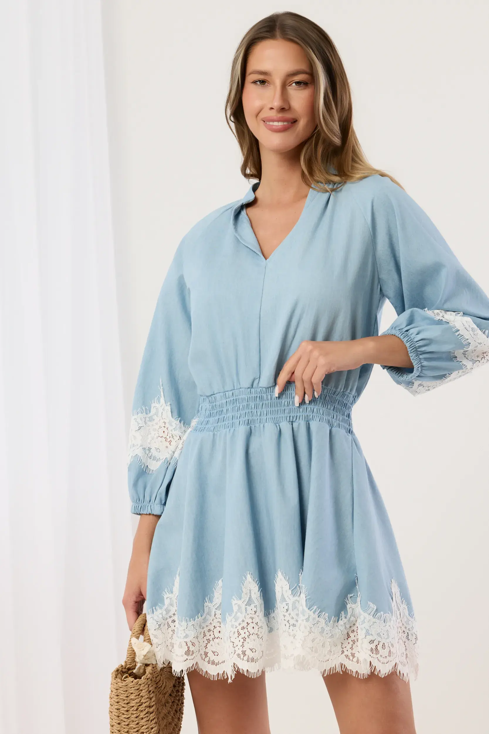 Krótka sukienka o luźnym kroju wykonana z lekkiej tkaniny o gładkim splocie. Model z dekoltem w serek i subtelnym stójkowym kołnierzem. Długi rękaw typu kimono wykończony elastycznym mankietem z marszczeniem. Odcięcie w talii z szerokim, elastycznym pasem typu gumka, który podkreśla sylwetkę, nadając całości kobiecy kształt. Dół wykończony szeroką wstawką z ażurowej, haftowanej koronki o kwiatowym motywie z ozdobnym ząbkowaniem. Podobne zdobienia umieszczono na rękawach. Długość mini. Idealna do zestawienia z sandałami na obcasie lub plecionymi akcesoriami.