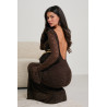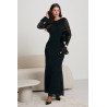 Sukienka maxi wykonana z elastycznej koronki, która podkreśla sylwetkę. Model z długimi rękawami zakończonymi subtelnie rozszerzanym mankietem. Tył z efektownym, głębokim wycięciem, które dodaje kreacji wyrazistości. Idealna na wieczorne wyjścia, przyjęcia lub wyjątkowe okazje. Łączy elegancję z odrobiną zmysłowości w ponadczasowym wydaniu.