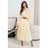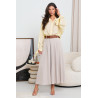 Rozkloszowana spódnica o długości midi z wyraźnie zaznaczonymi zaszewkami w pasie, które nadają całości elegancką linię i ładne ułożenie materiału. Model z paskiem w talii podkreślającym proporcje sylwetki. Po bokach praktyczne kieszenie dyskretnie wszyte w szwy. Fason swobodnie rozszerza się ku dołowi, zapewniając lekkość i komfort noszenia. Spódnica dobrze sprawdzi się w wiosennych stylizacjach, zarówno z koszulą, jak i prostym topem lub swetrem.
