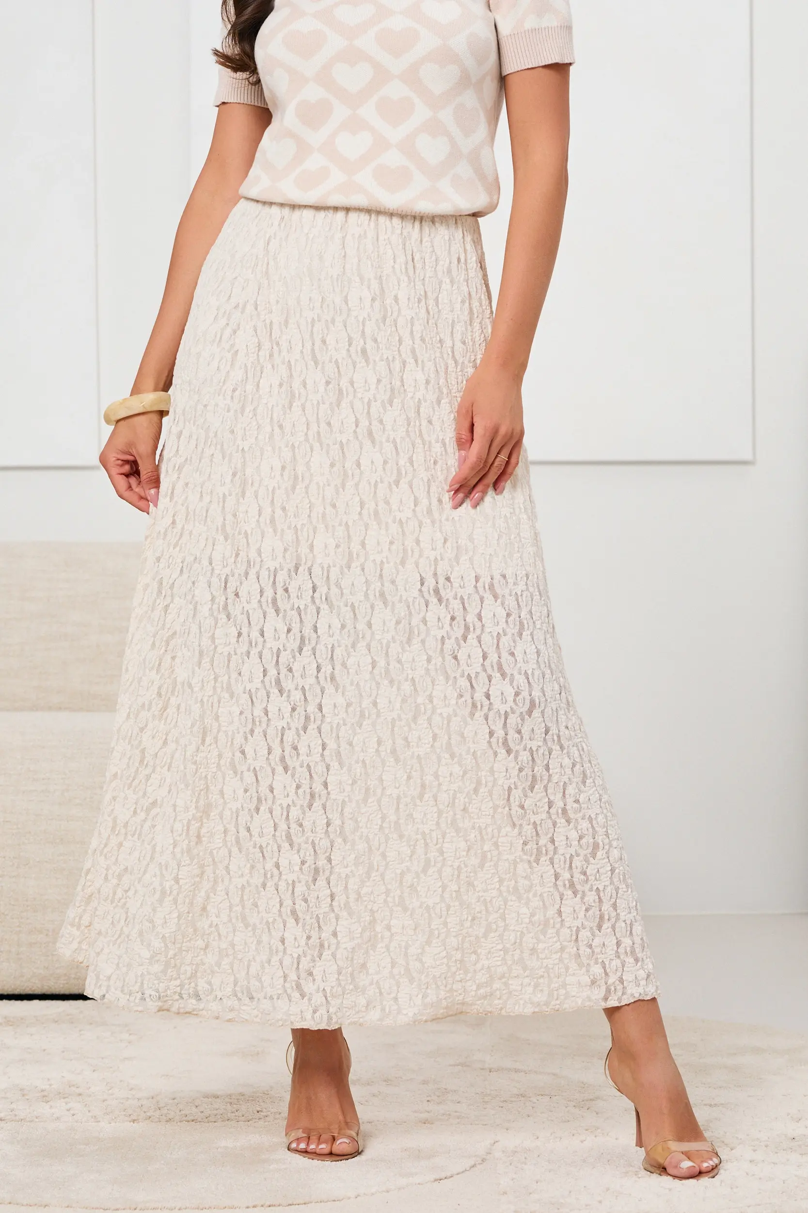Spódnica midi o lekko rozkloszowanym fasonie, który miękko układa się na sylwetce i nadaje całości lekkości. Wykonana z ażurowej koronki o dekoracyjnym splocie, tworzy wyraźny, ale subtelny efekt struktury. Model posiada wewnętrzną podszewkę w formie krótkiej spódnicy, zapewniającą komfort noszenia i odpowiednie krycie, jednocześnie eksponując długość i transparentność warstwy zewnętrznej. Elastyczna talia podkreśla proporcje i gwarantuje wygodne dopasowanie. Kontrast warstw oraz rozkloszowana linia nadają spódnicy nowoczesny, kobiecy charakter z wyraźną nutą elegancji.