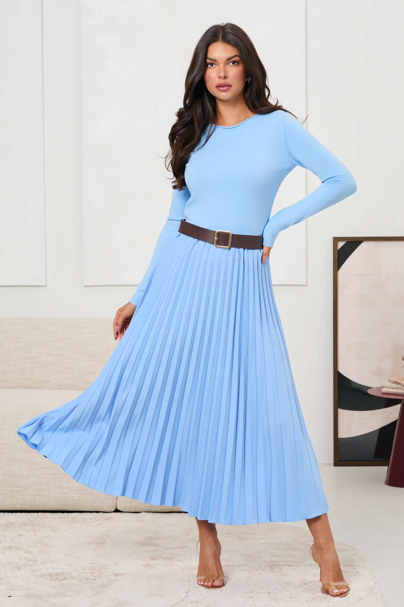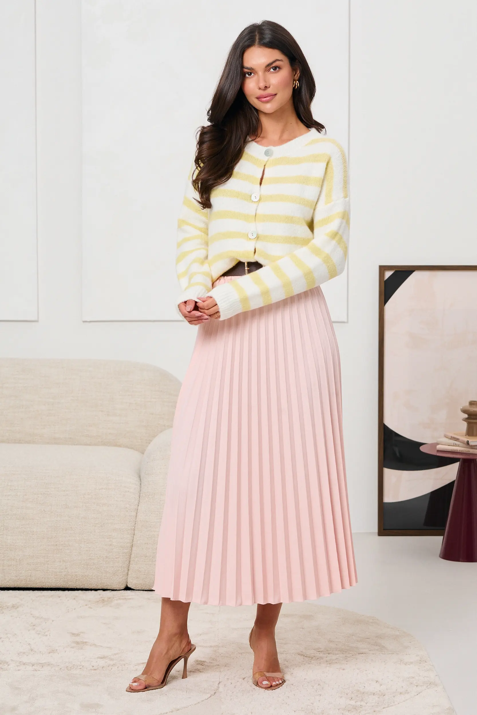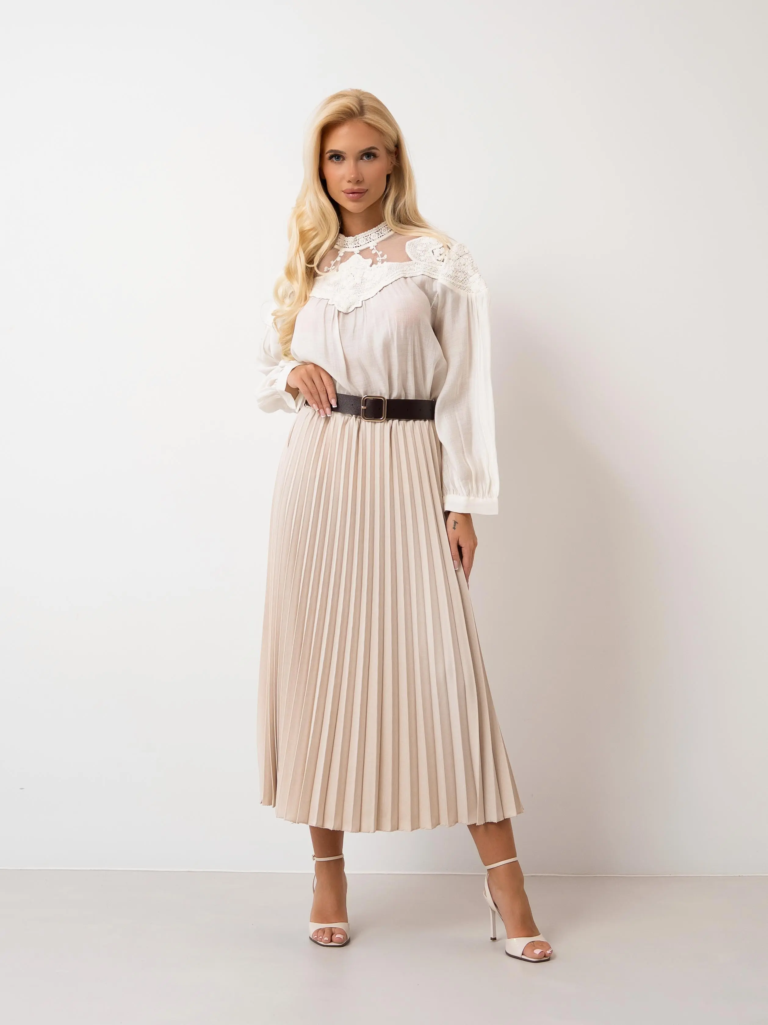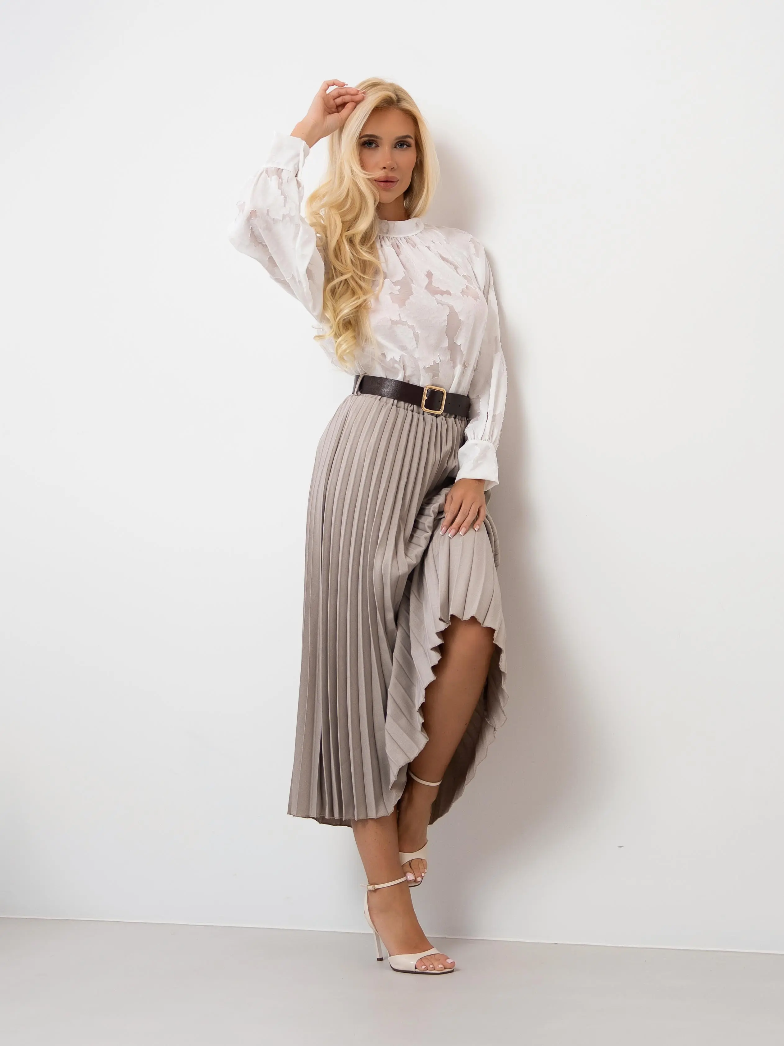 Plisowana spódnica midi o klasycznej, eleganckiej linii, która swobodnie układa się w ruchu. Regularne plisy nadają całości lekkości i rytmicznej struktury, podkreślając kobiecy charakter fasonu. Model o prostym kroju z delikatnym rozszerzeniem ku dołowi, który zachowuje czyste proporcje sylwetki. W talii zastosowano pasek, który porządkuje formę i subtelnie akcentuje linię pasa. Długość midi sprawia, że spódnica sprawdzi się zarówno w codziennych stylizacjach, jak i w bardziej eleganckich zestawach, łącząc klasykę z nowoczesnym wykończeniem.