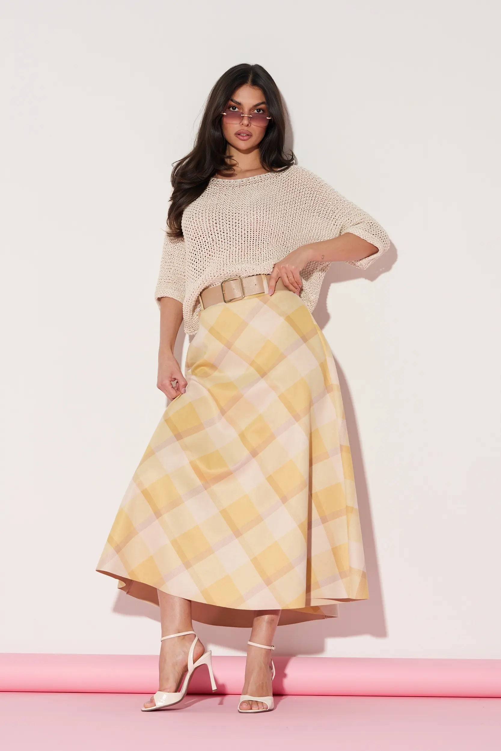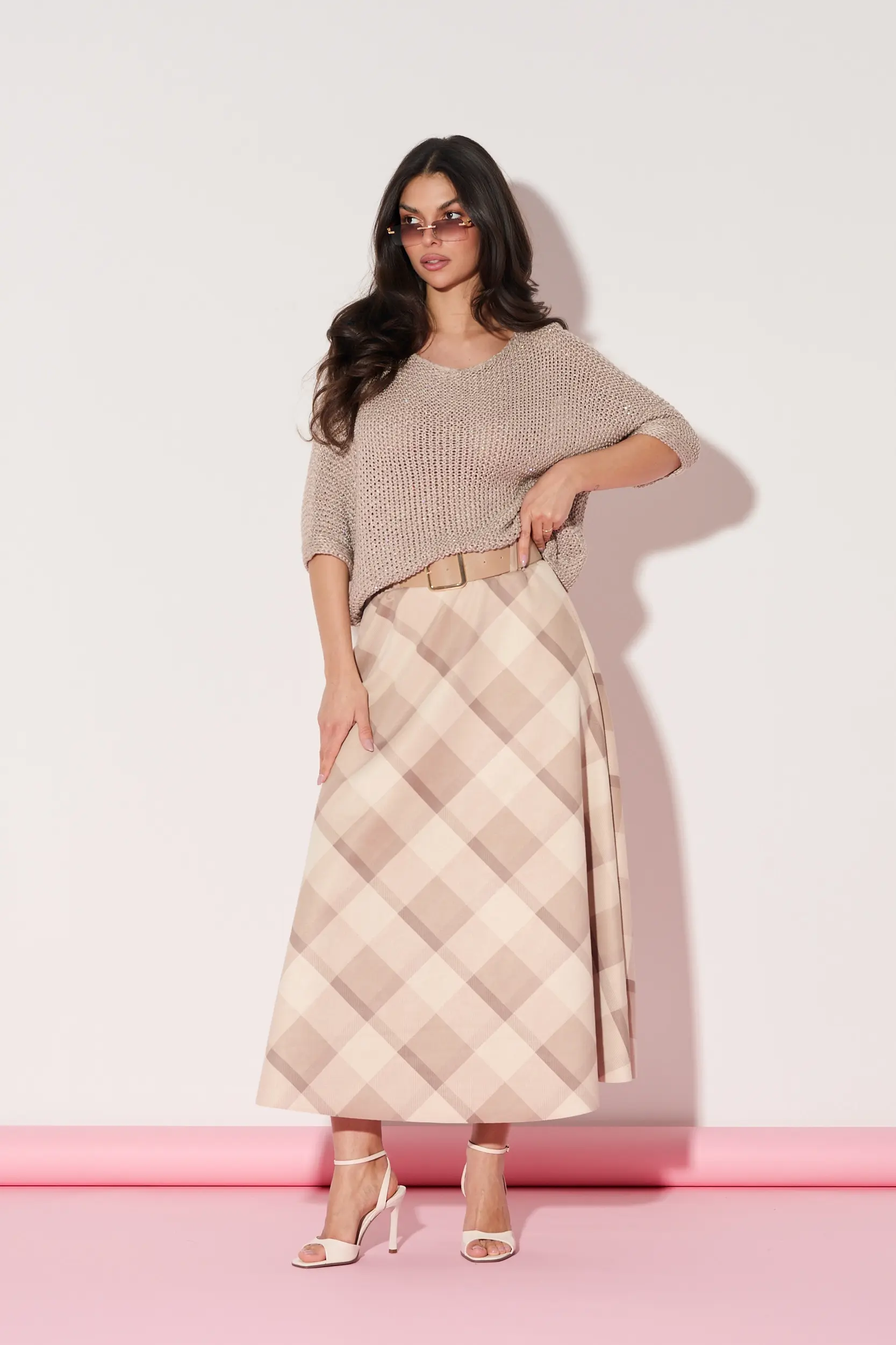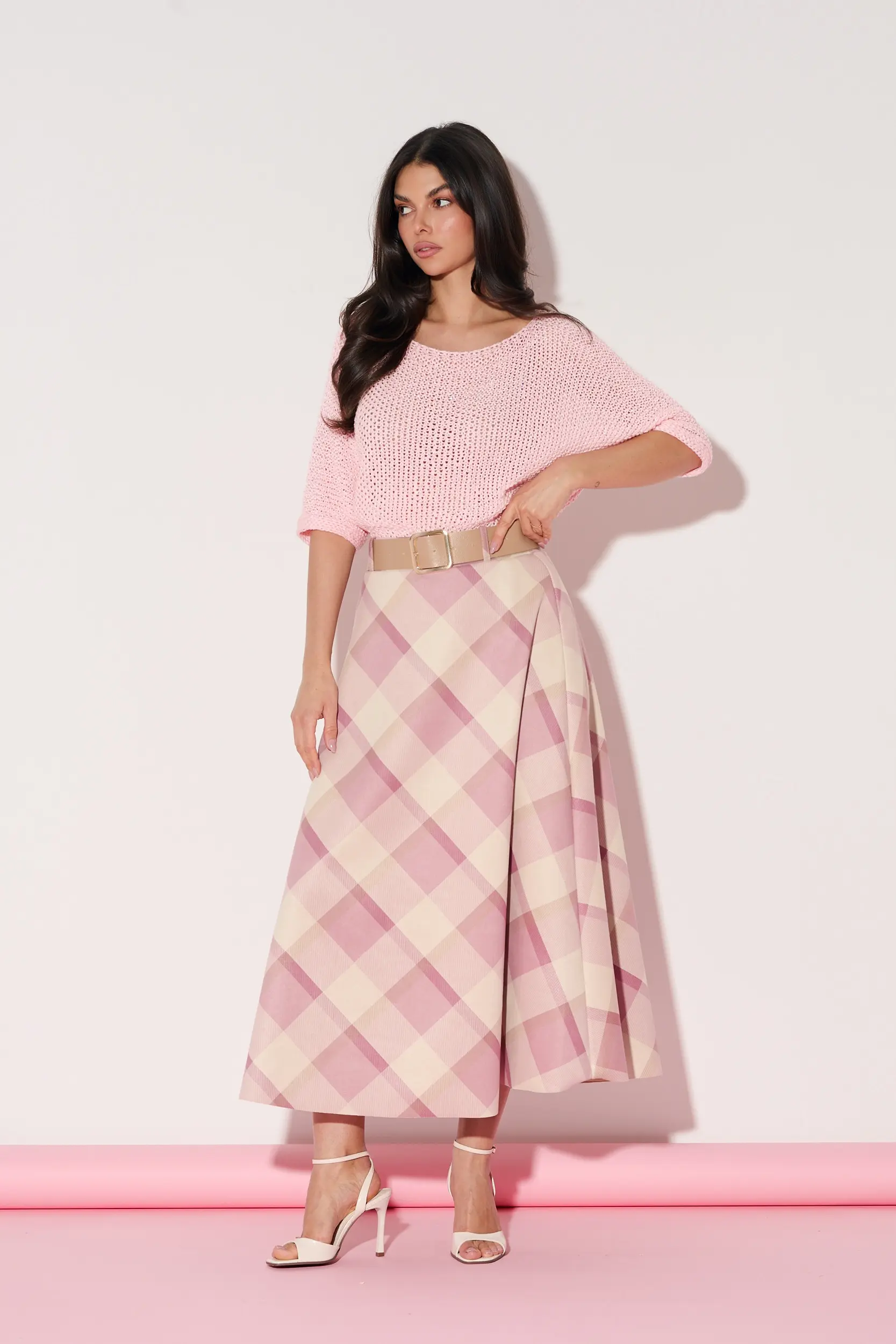 Elegancka spódnica midi w subtelną, pastelową kratę to doskonałe połączenie klasyki i nowoczesnych trendów. Model o długości midi pięknie układa się na sylwetce, zapewniając komfort noszenia i kobiecy wygląd. Delikatna kolorystyka sprawia, że spódnica prezentuje się lekko i świeżo, idealnie wpisując się w wiosenno-letnie kolekcje. Spódnica posiada dołączony pasek, który podkreśla talię i nadaje całości eleganckiego charakteru. Rozkloszowany fason zapewnia swobodę ruchów oraz atrakcyjny wygląd zarówno w stylizacjach casualowych, jak i bardziej formalnych.